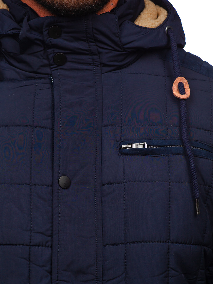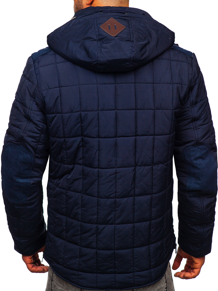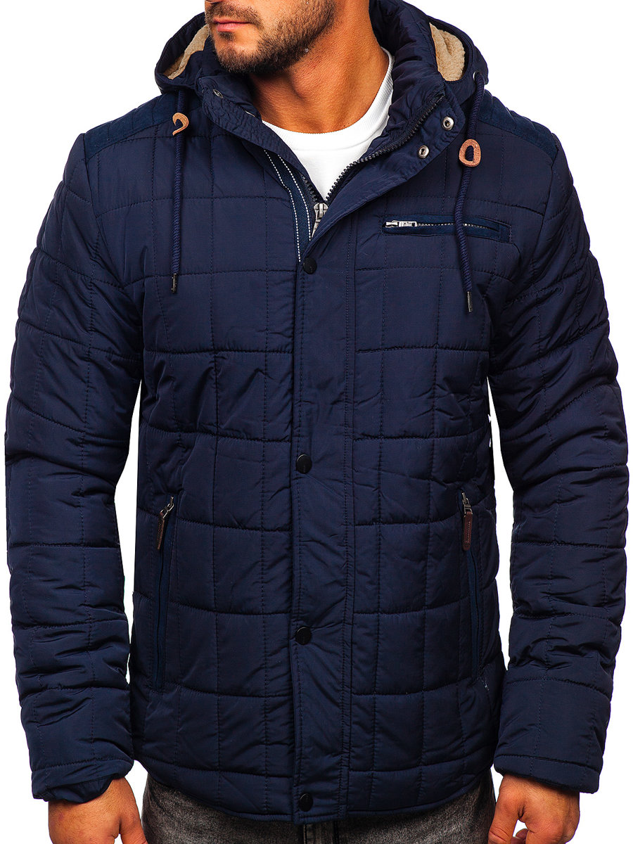 Chaqueta de invierno Bolf práctica, cálida y de moda, color azul oscuro. Se distingue por sus acolchados formados en cuadros, capucha forrada, parches en los codos y ribetes de velur que realzan la línea de los hombros. Esta chaqueta de hombre azul oscuro quedará genial con estilos cotidianos para días fríos.