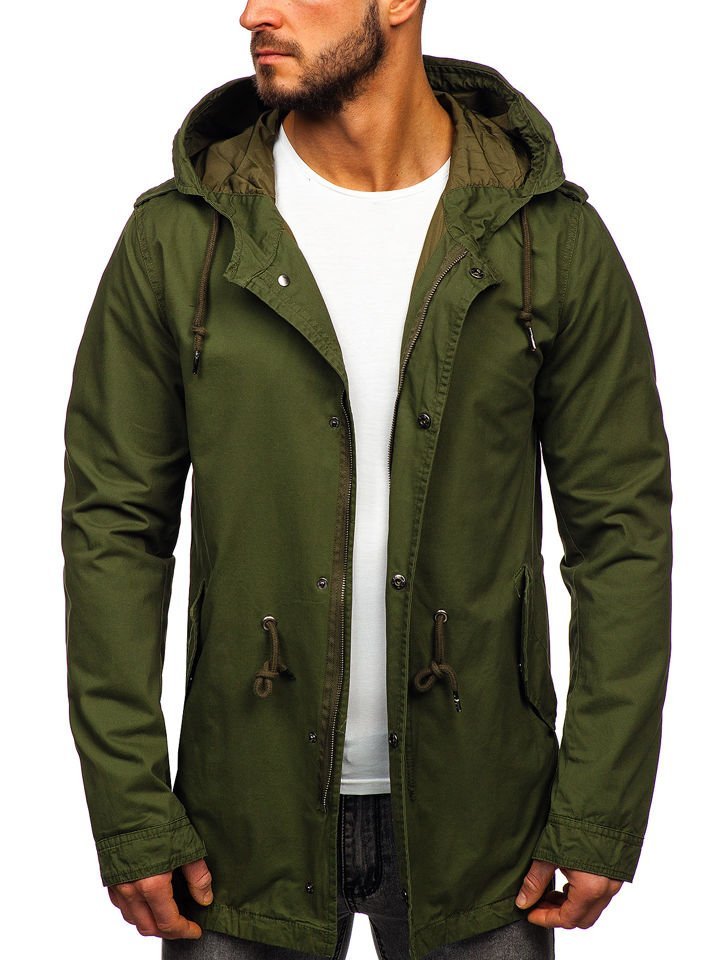 Chaqueta de entretiempo 5391 para hombre, con cierre de cremallera y botones automáticos. Larga hasta la mitad del muslo, corte recto. La chaqueta cuenta con dos bolsillos externos con cierre de botones a presión y un bolsillo interno. Ajustable con cordón en la cintura y en la capucha. Tiene puños con cierre de botones a presión y galones en los hombros que le añaden un toque militar. El color verde oscuro intenso se combina perfectamente tanto con estilos atenuados como con los más atrevidos.