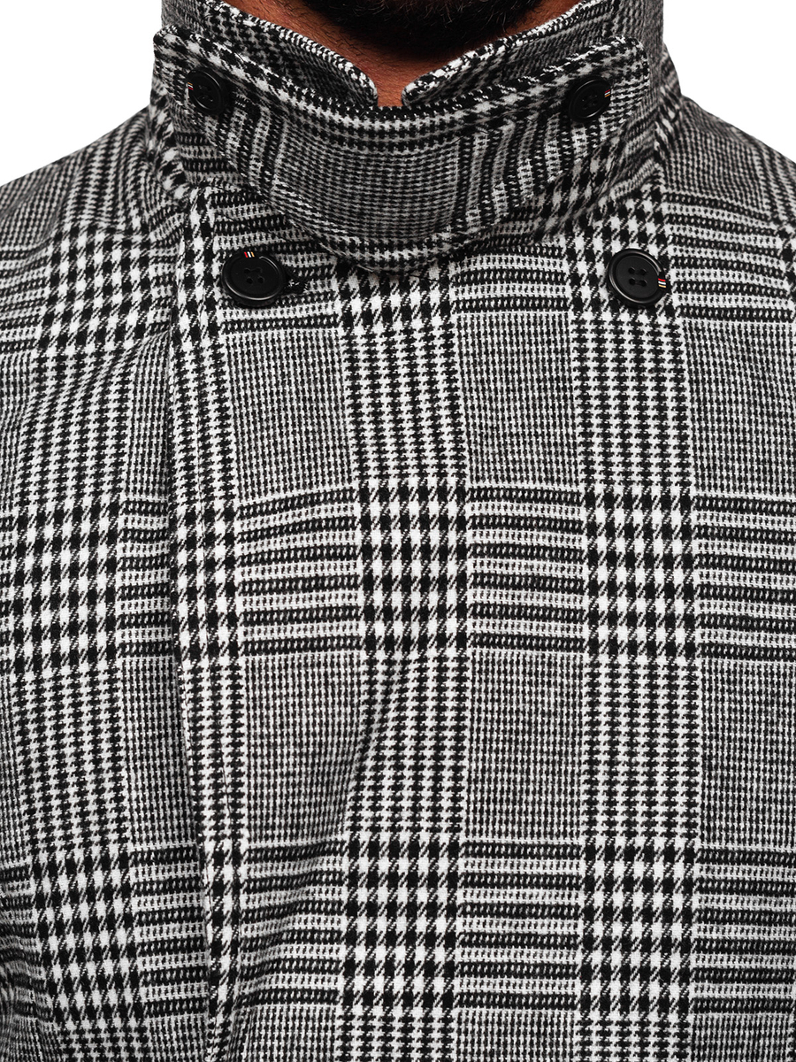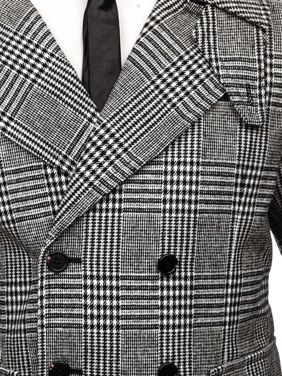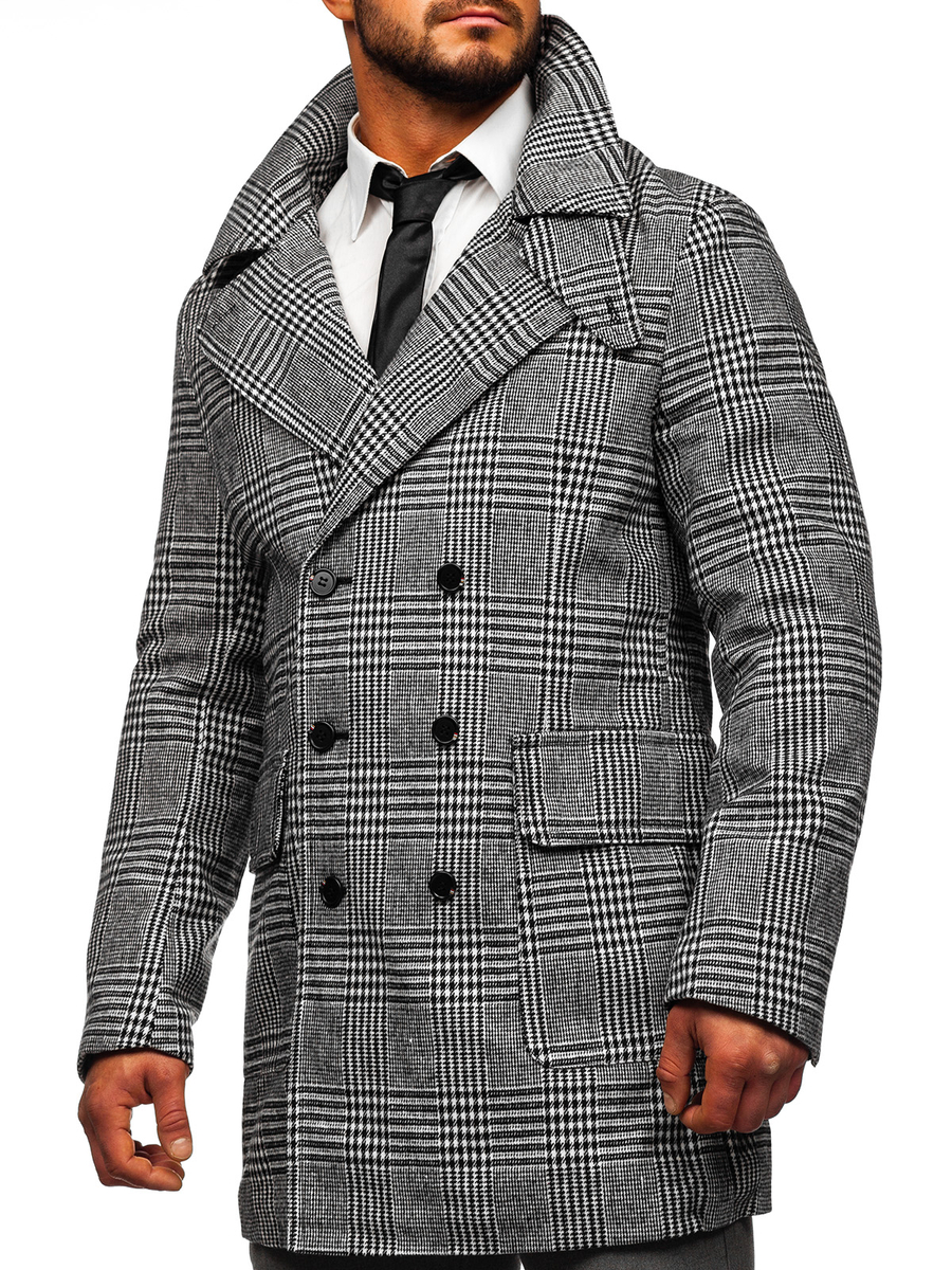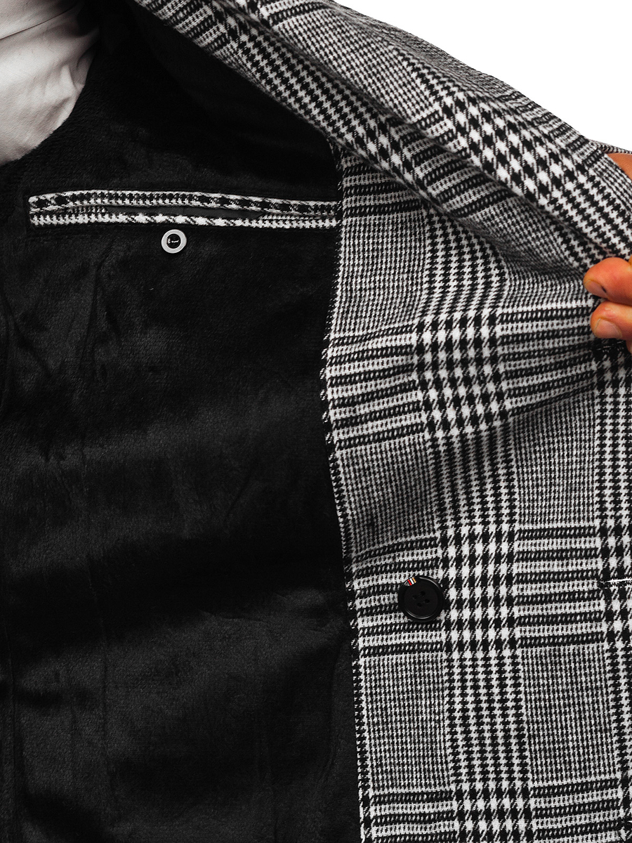 El abrigo de invierno aislado a cuadros color gris Bolf 1192 para hombre es una combinación perfecta para el guardarropa de un hombre elegante y moderno. Es un abrigo clásico de doble botonadura aislado, abrochado con botones. Su carácter se ve reforzado por un cuello inverso grande y elegante. Tiene dos bolsillos exteriores con botones automáticos y un bolsillo interior con botón, en el que puedes esconder las baratijas más importantes y valiosas o una cartera. Los elementos decorativos son botones cosidos en los extremos de las mangas. El abrigo está hecho de tela de alta calidad. Es muy original, pero gracias al material a cuadros, también tiene una elegancia atemporal. Perfecto para pantalón chino, camisa y americana Combínalo con vaqueros y un jersey con cuello alto para un look casual.