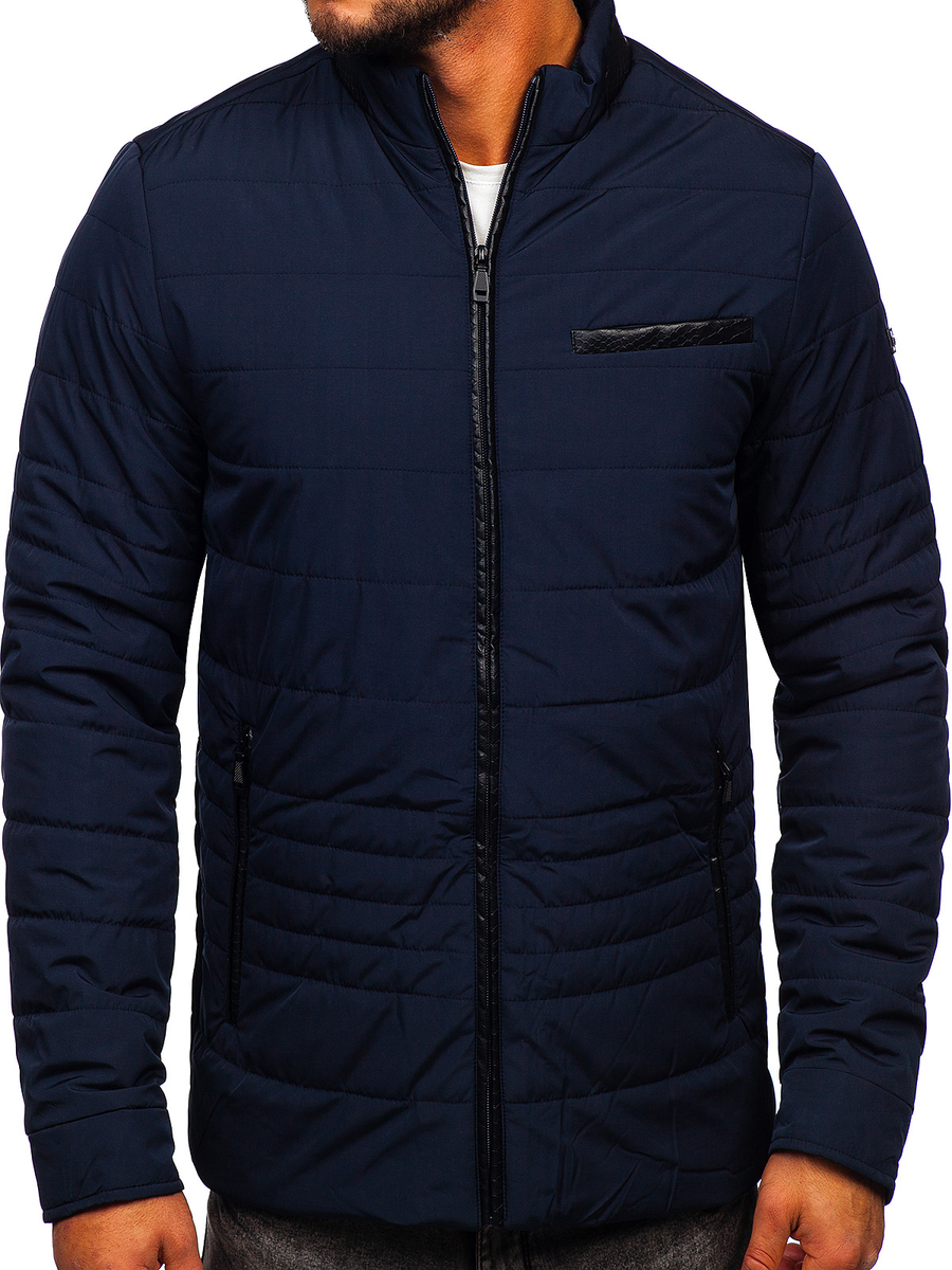 La chaqueta acolchada de entretiempo para hombre color azul oscuro Bolf 22M12 es perfecta para las temporadas de entretiempo, primavera y otoño. Se abrocha con cremallera y tiene cuello alzado. El corte ajustado y simple hace que todos se vean excepcionalmente ventajosos con él. La chaqueta está fabricada con materiales de alta calidad, lo que la hace muy cómoda y agradable al tacto. Tiene dos bolsillos exteriores, con cremallera y un imitación de bolsillo el pecho. La chaqueta tiene un bolsillo interior adicional, sin cierre. Gracias a su versatilidad, el producto se puede combinar con muchos estilos. Perfecto para pasear, reunirse con amigos o salir a la ciudad. Esta chaqueta será la combinación perfecta con pantalón chino y pantalón deportivol.