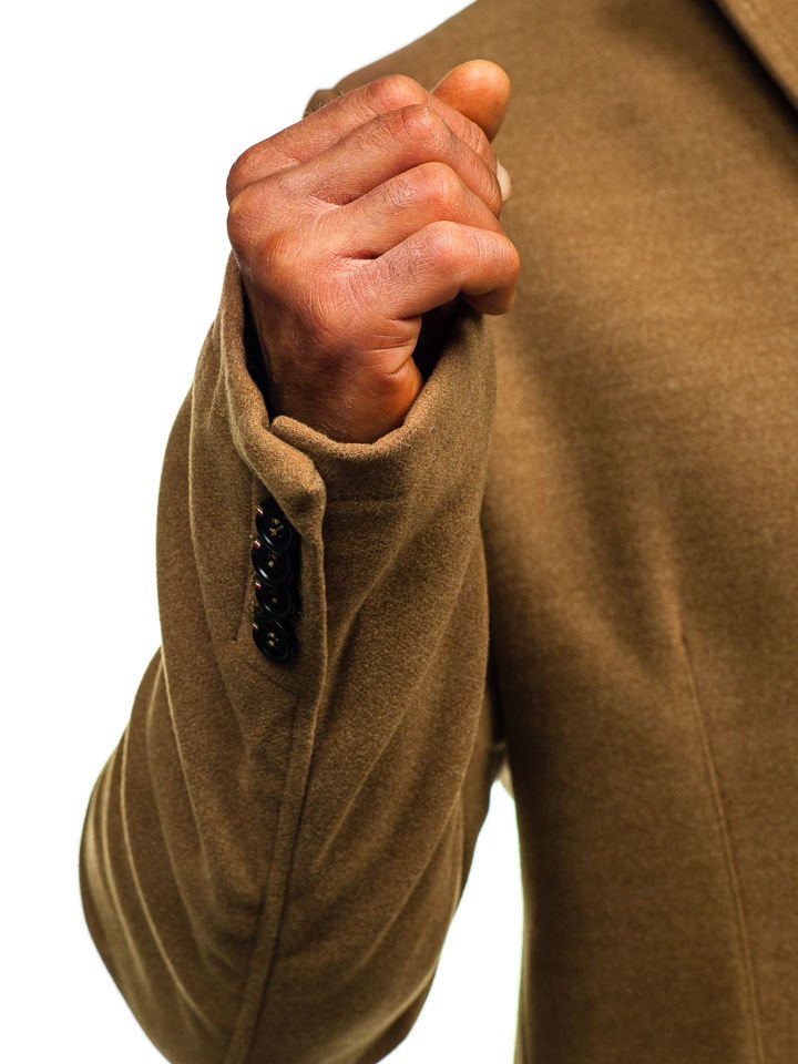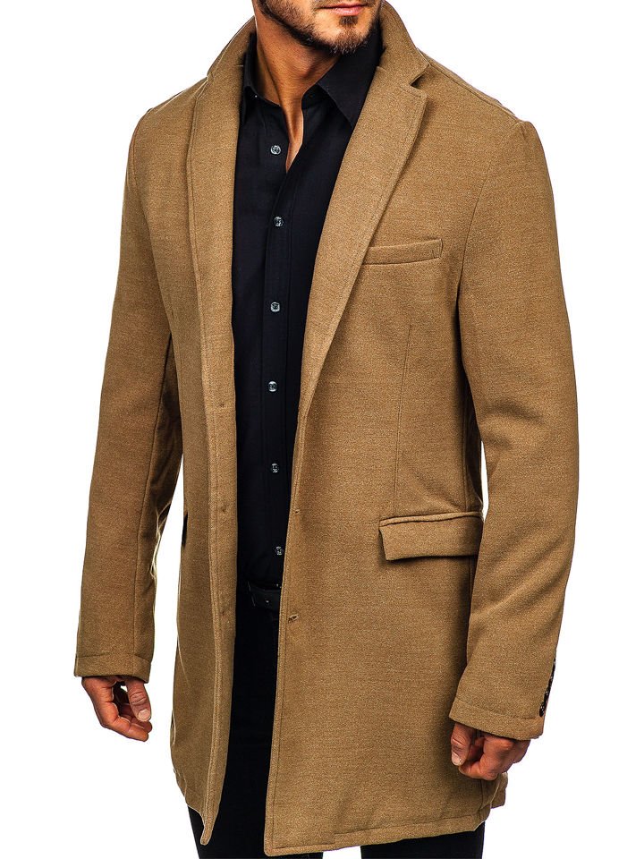 Abrigo de invierno para hombre color camel Bolf 1047 es un sensacional abrigo chesterfield de abotonadura sencilla. Será perfecto para los días fríos de invierno, porque tiene un forro de pelo cálido y está hecho de tela gruesa. El abrigo se abrocha con botones, tiene un cuello clásico con solapas abiertas y un peto impresionante. Tiene dos bolsillos exteriores rematados con una solapa y dos bolsillos interiores abrochados con un pequeño botón. El carácter se ve reforzado por los botones decorativos al final de las mangas y una elegante abertura en la espalda.