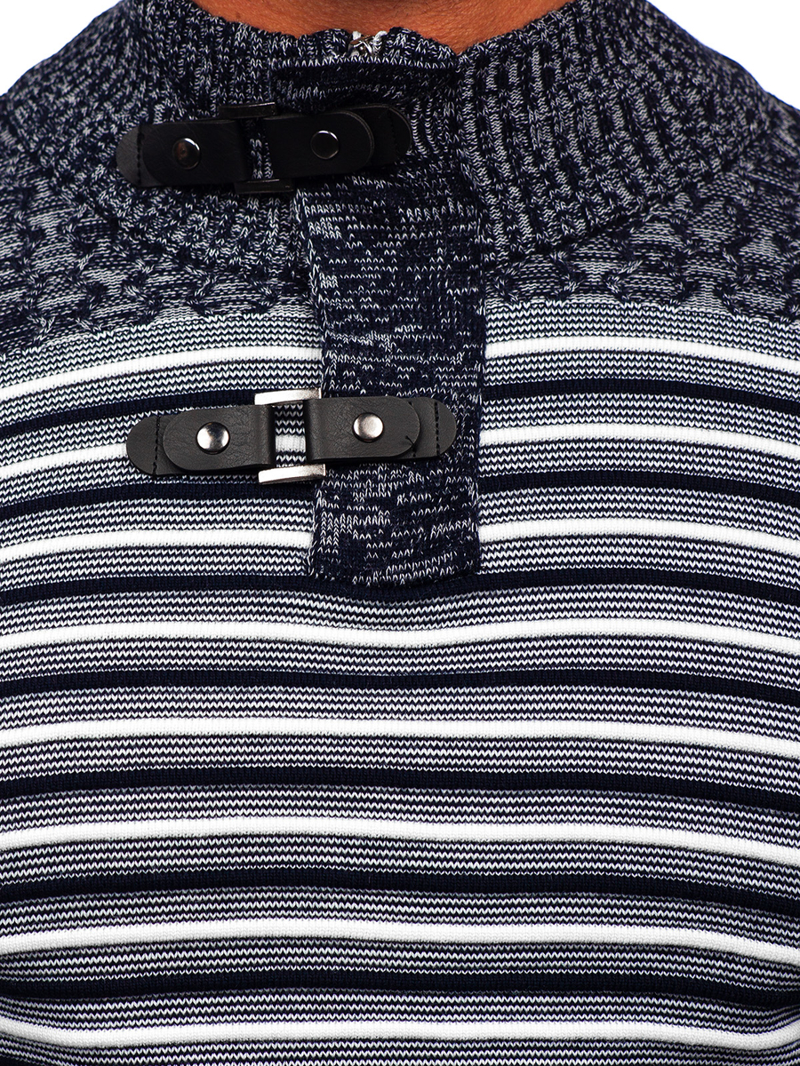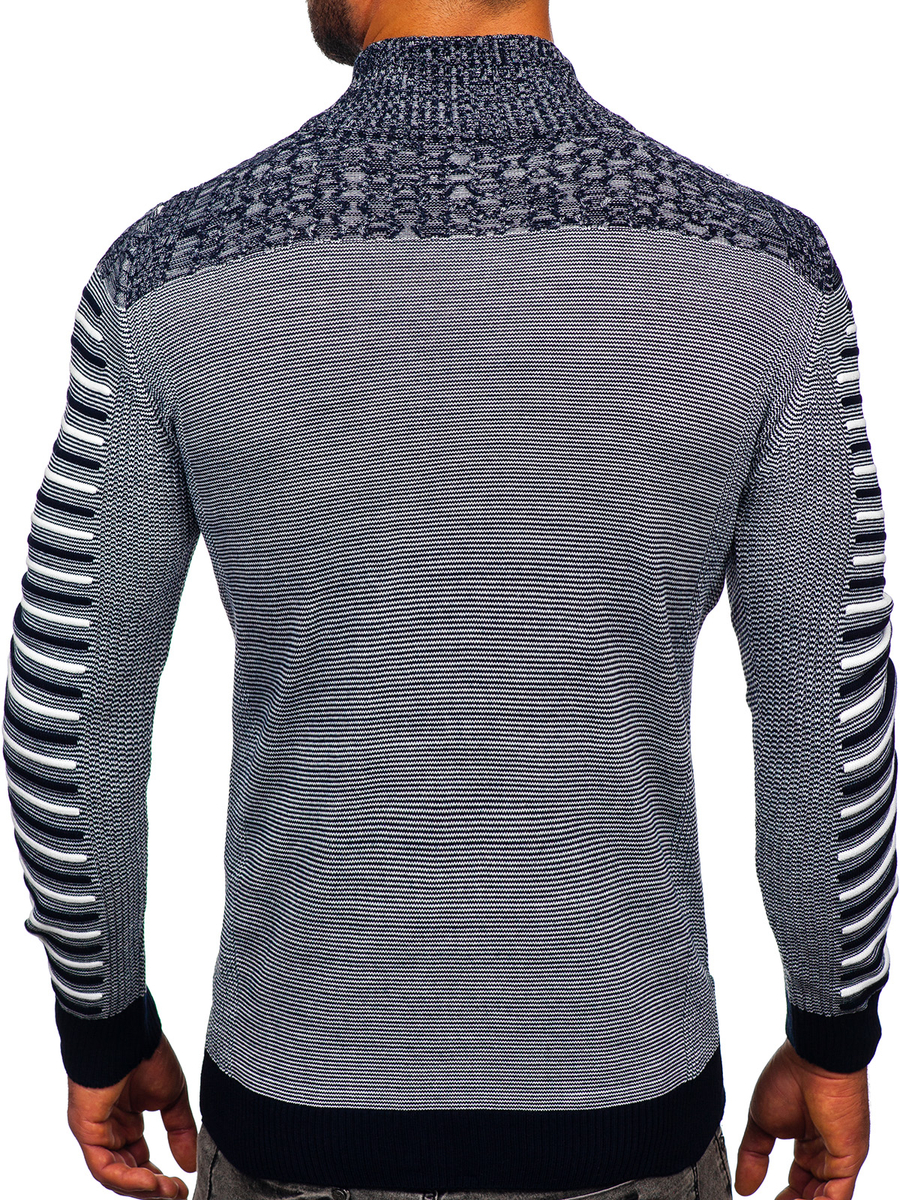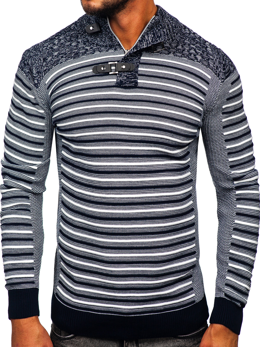 Jersey con cuello elevado azul oscuro para hombre Bolf 1028 es un jersey con corte sencillo y clásico. Cuenta con cuello alto delicado con cierre de cremallera y botones a presión. Puños, bajo y cuello acabados con un elástico, y por lo tanto ese jersey se ajusta a cualquier silueta, se mantiene muy cómodo. Confeccionado en 50% de lana y 50% de acrílico. El modelo está disponible en tres variedades de color, así que sin duda podrá elegirse uno. Rayas de moda le añade carácter. Gracias a su gama de colores atenuados, el jersey se combina con outfits más claros y más oscuros. Llévalo al trabajo, al cole, paseos o cita con amigos – perfecto, bez względu na okazję. Se combina muy bien con joggers y chaqueta bomber, y así crear un estilo más holgado para un paseo por la noche. Jersey clásico puede combinarse con chinos y chaqueta de cueropara obtener un outfit perfecto en una cita con amigos