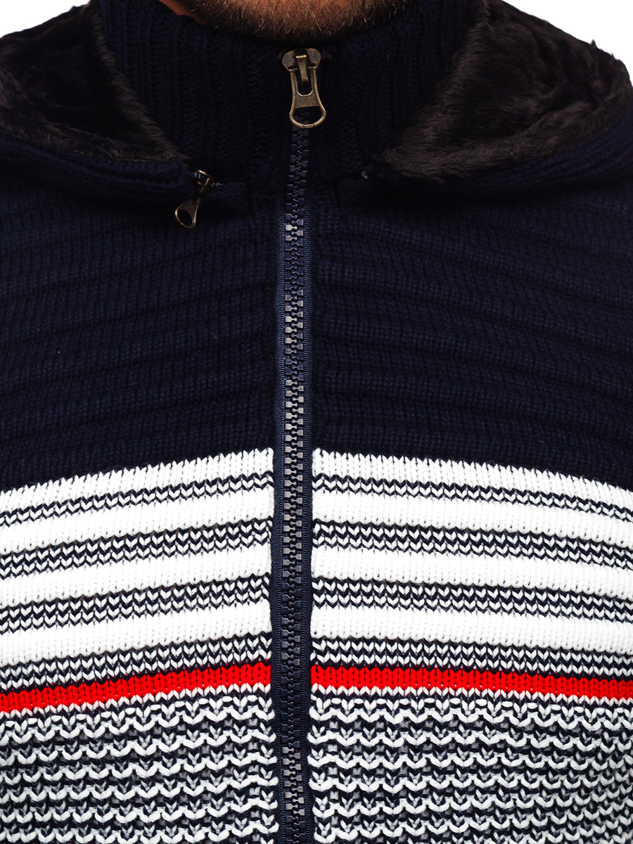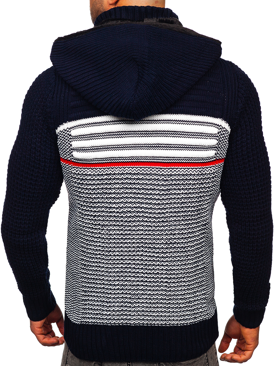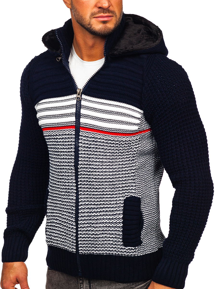 El suéter grueso con capucha para hombre color azul oscuro Bolf 2031 de corte clásico, abrochado con cremallera. Está disponible en tres versiones de color. El bajo y las mangas están acabadas con un ribete, gracias al cual el suéter se adapta a cada figura. Material agradable al tacto, da una sensación de conveniencia y comodidad mientras se usa. El producto esta hecho de 70% acrílico y 30% lana. Este modelo de producto tiene una práctica capucha extraíble y dos bolsillos laterales. El corte del producto le permite crear muchos estilos extraordinarios. Úselo para el trabajo o una reunión familiar. Deleita a tus seres queridos y compón tu look elegante con camisa y panalón chino. Para estilos más holgados, combine un suéter con una camiseta y pantalón vaquero.