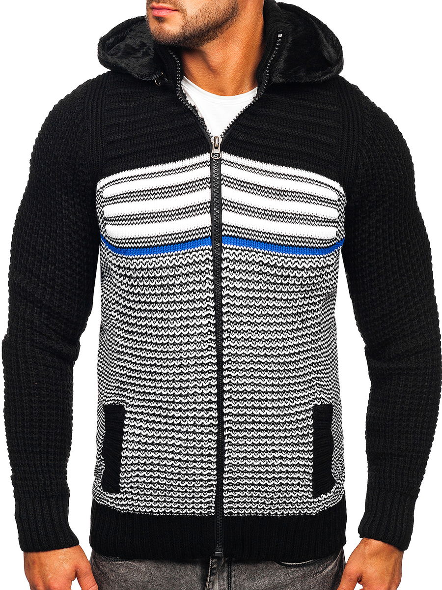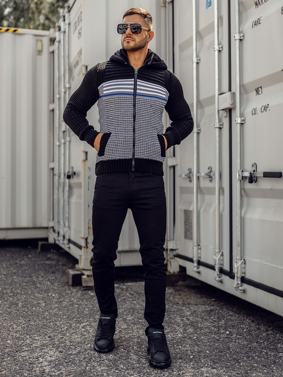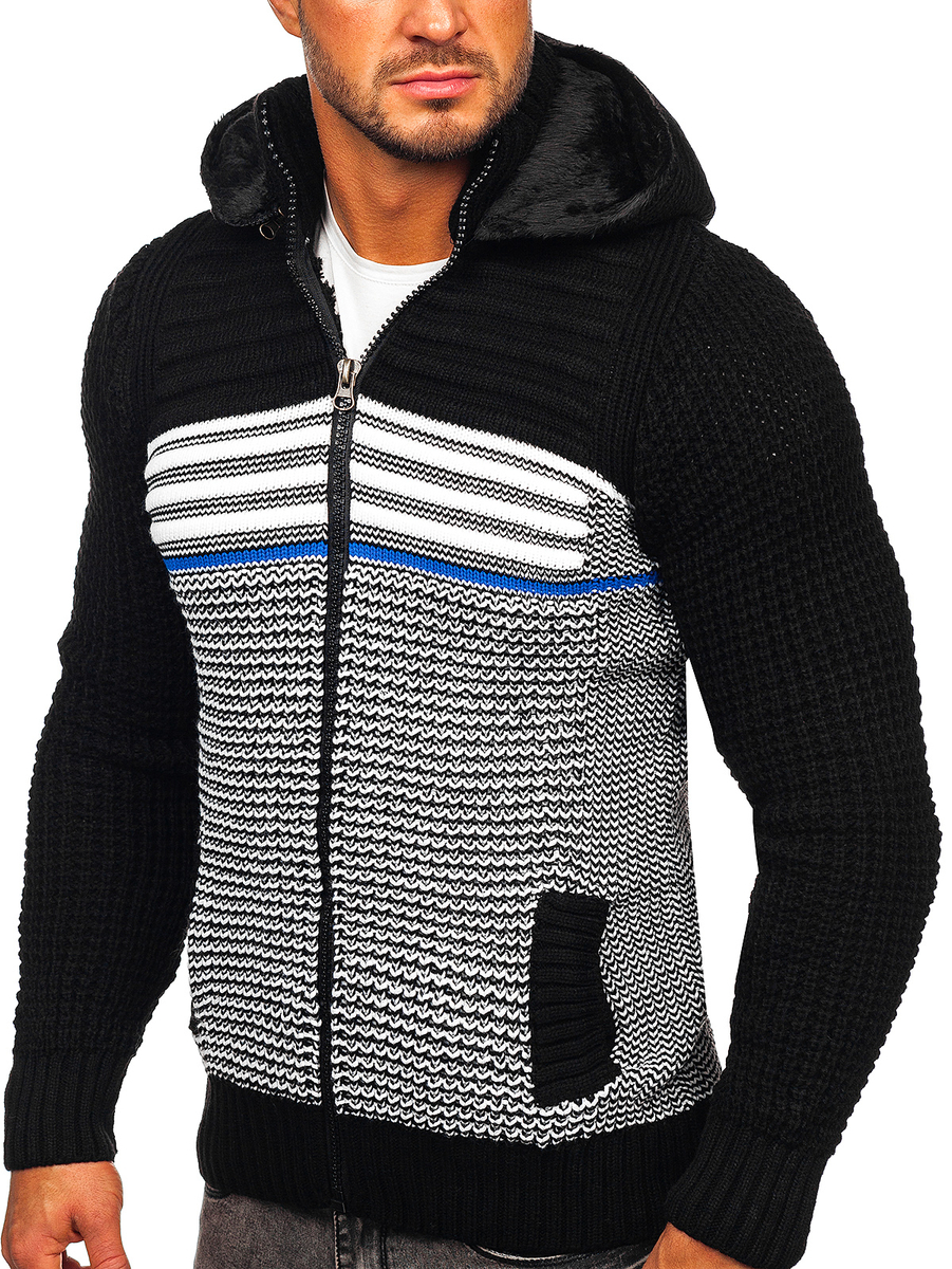 El suéter grueso con capucha para hombre color negro Bolf 2048 de corte clásico, abrochado con cremallera. Está disponible en tres versiones de color. El bajo y las mangas están acabadas con un ribete, gracias al cual el suéter se adapta a cada figura. Material agradable al tacto, da una sensación de conveniencia y comodidad mientras se usa. El producto esta hecho de 70% acrílico y 30% lana. Este modelo de producto tiene una práctica capucha extraíble y dos bolsillos laterales. El corte del producto le permite crear muchos estilos extraordinarios. Úselo para el trabajo o una reunión familiar. Deleita a tus seres queridos y compón tu look elegante con camisa y panalón chino. Para estilos más holgados, combine un suéter con una camiseta y pantalón vaquero.