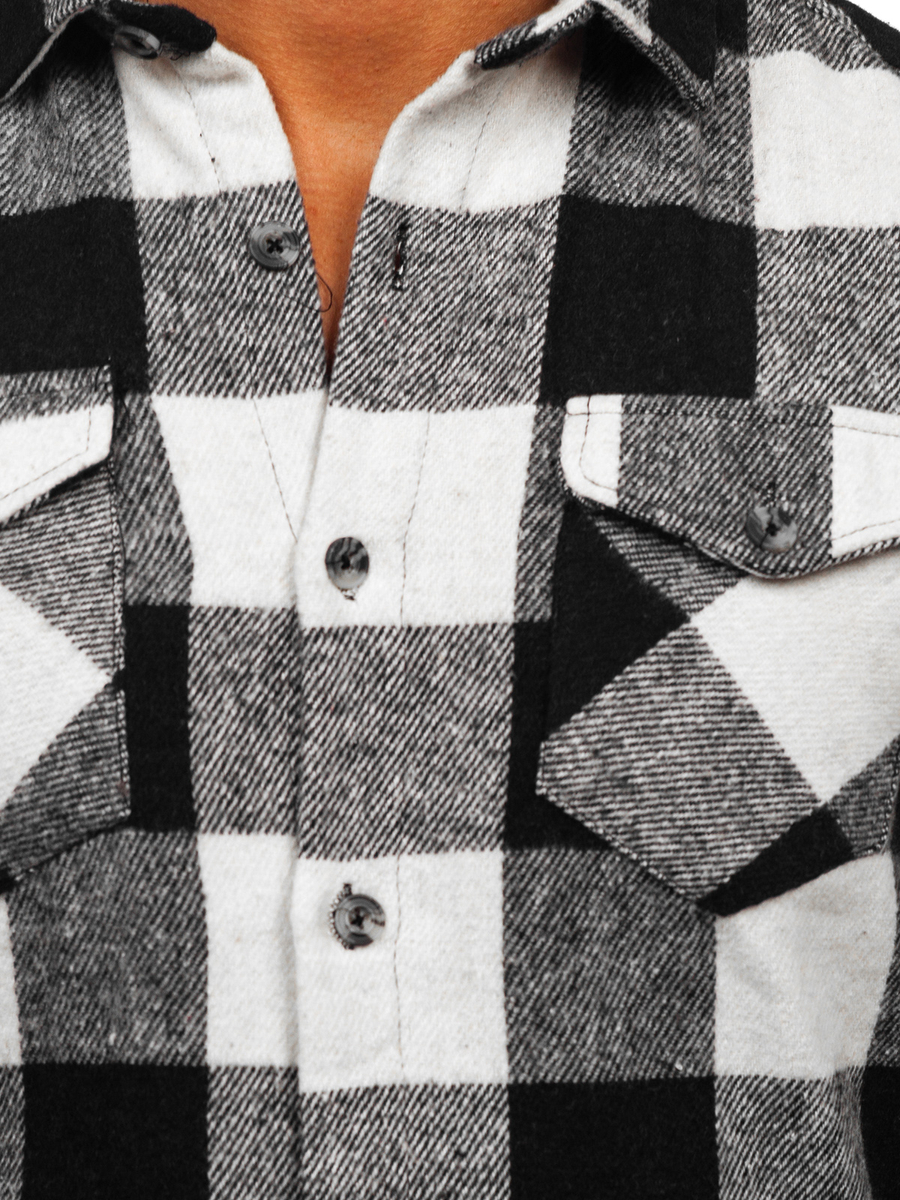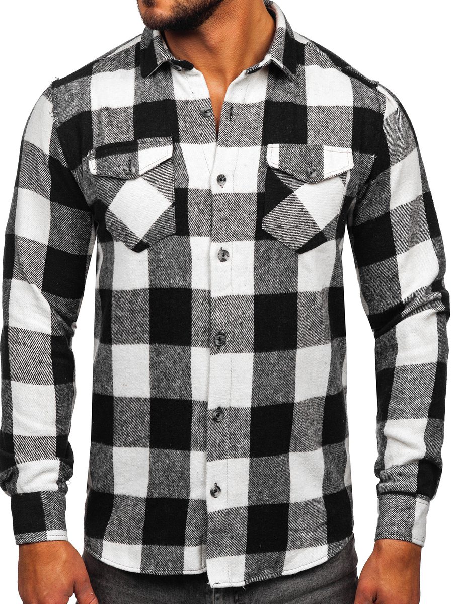 Camisa de franela a manga larga para hombre color blanco y negro Bolf 20723 es un producto abotonado con cuello hai. La camisa tiene dos elegantes bolsillos abrochados con un botón. Bajo redondeado El producto tiene puños, que también se abrochan con un botón.