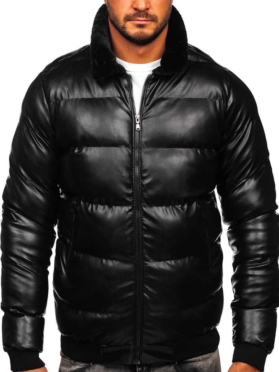 Chaqueta acolchada de cuero ecológico de invierno para hombre negra Bolf 0022 es uno de los artículos de invierno obligatorios. Chaqueta está hecha de cuero ecológico, tiene un cuello con pelo decorativo que protege muy bien del viento y el frío. Cuenta con tres bolsillos, dos exteriores y un interno, todos con cierre de cremallera a donde puede guardar su teléfono, su cartera o sus documentos. Bajo y puños acabados con elástico, y por lo tanto se ajusta bien a la silueta. El producto está hecha con materiales de alta calidad, por lo que es cálida y muy cómodo. La puedes llevar al trabajo, al cole, de paseo o de compras. Combínala con una camiseta de manga larga y vaqueros para una cita con amigos. Si combine esa chaqueta con un jersey y joggers, te consigue un look perfecto para los días más frescos.