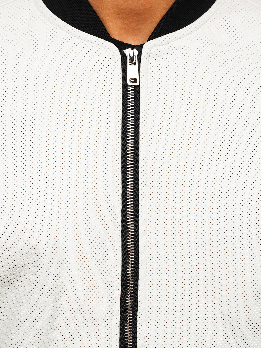 Chaqueta de cuero para hombre 7110 blanca tiene un corte clásico y sencillo. Se cierra con cremallera y tieneun cuello tipo alto acabado en un punto elástico .. Cuenta con dos bolsillos externos con cierre de cremallera y un bolsillo interno le añaden carácter práctico. Puñosy bajo en punto elástico, que mantiene genial el calor y protege muy bien del viento.. Esta chaqueta de cuero tiene un corte universal, es de estilo casual, por lo tanto es perfecta para toda ocasión. Confeccionado de dos telas combinadas, de cuero ecológico. Se combina genial con joggers, vaqueros o con pantalones deportivos si se desea crear un estilo holgado.