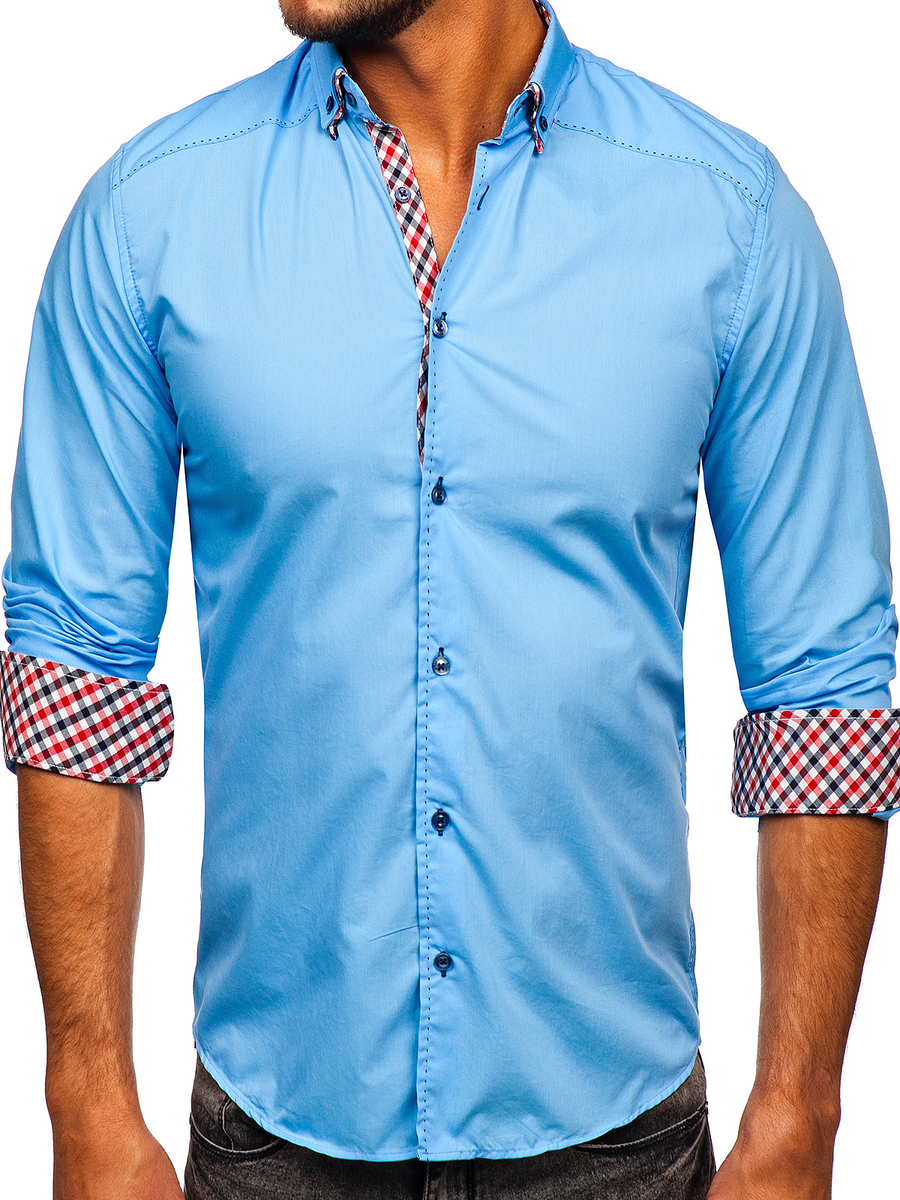 Camisa de manga larga Bolf con estilo, de color azul claro, perfecta para crear outfits diarios. Ajustada, con puntadas en contraste, cuello bonito y detalles con diseño de cuadros. Esta camisa azul claro slim fit tiene bajo redondeado. Puedes llevarla también dentro del pantalón.