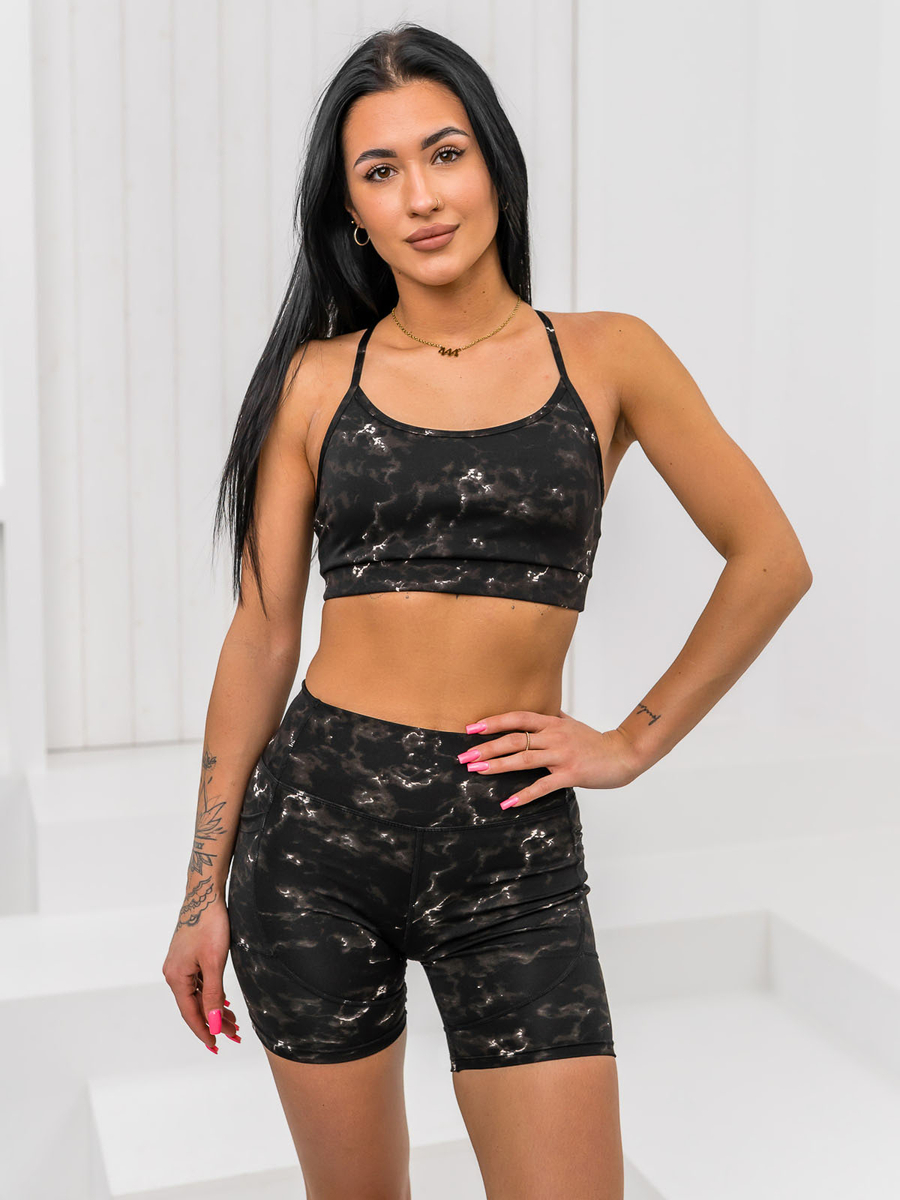 Chándal deportivo de dos piezas para mujer, de color negro, Bolf XL015, es un conjunto que incluye el sostén y un pantalón corto. Pantalón corto se ajusta con un elástico fuerte en la cintura, tiene dos bolsillos laterales sin cierre. El sujetador tiene almohadillas acolchadas, bajo en punto elástico, por lo que se ajusta perfectamente a la silueta. Ese producto está confeccionado de una tela suave, agradable al tacto. Se combina genial con una sudadera, una chaqueta deportiva y un chaleco. Te verás espectacular con él, ¡ya que es una prenda indispensable para hacer deporte!