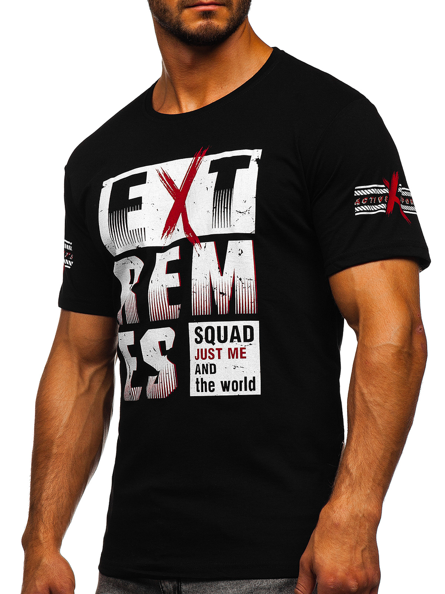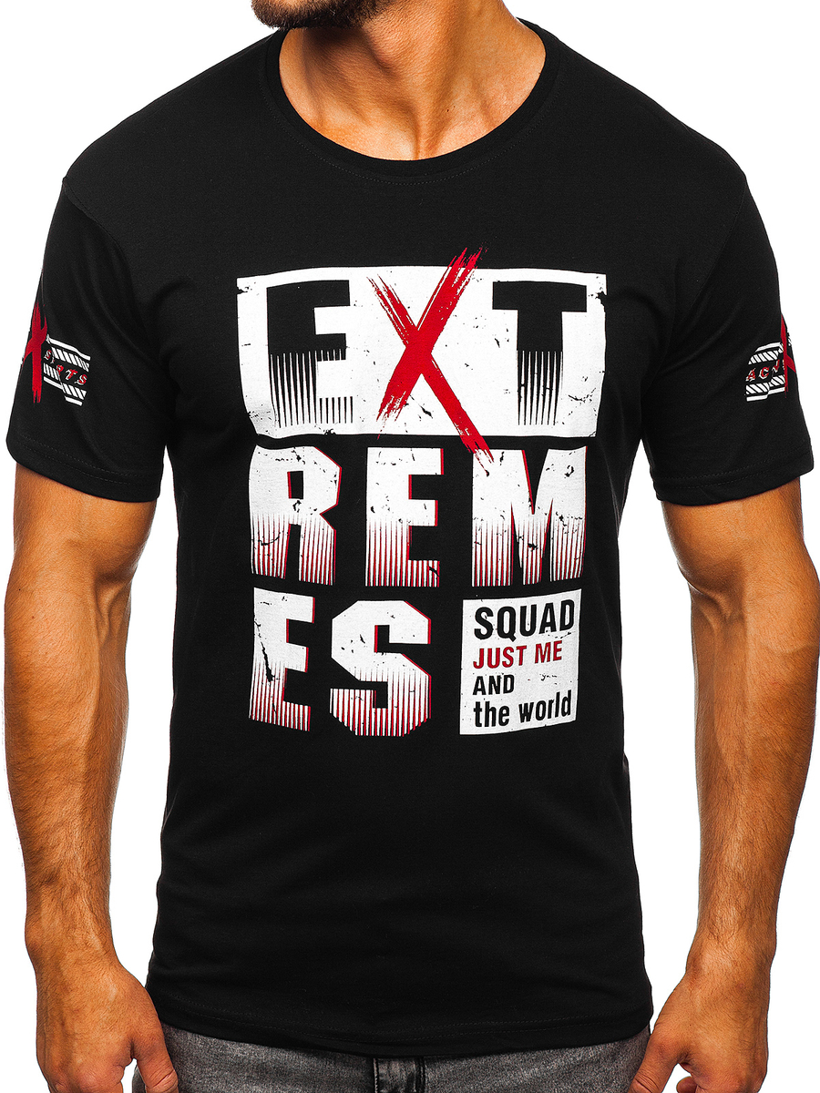 Camiseta de manga corta con impresión Bolf, 14312, de color negro esta un elemento versátil del estilo para hombres en una versión excepcionalmente actual. Camiseta de corte sencillo, con escote redondo, se ajusta perfectamente a la silueta. Gracias a su estampado original en la delantera, la camiseta añadirá un look original a todo tu outfit. Confeccionado en 100% de algodón. Su versatilidad le permite crear muchos outfits de moda. Genial para outfits tanto deportivos como causales. Combina la camiseta con unos pantalones de chándal y un chaleco para conseguir un look de moda y deportivo.