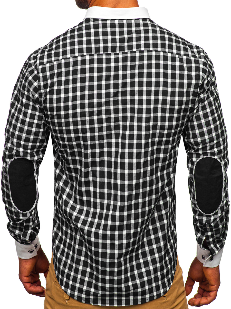 Camisa elegante a cuadros de manga larga para hombre Bolf 5737-1 de color negro, cuenta con un cuello americano. Puños sencillos, rectos, ajustables con un botón. El modelo slim fit con bajo redondeado, muy popular entre nuestros clientes, se ajusta perfectamente a la silueta. Los parches del codo y el logotipo en el pecho le añaden un look original. El modelo está disponible en varios colores. Esa camisa es perfecta tanto para las ocasiones informales como las más formales. Crea un look clásico y elegante con unos chinos y una americana. Y para un look más casual, lleva unos vaqueros y unachaqueta de cuero!