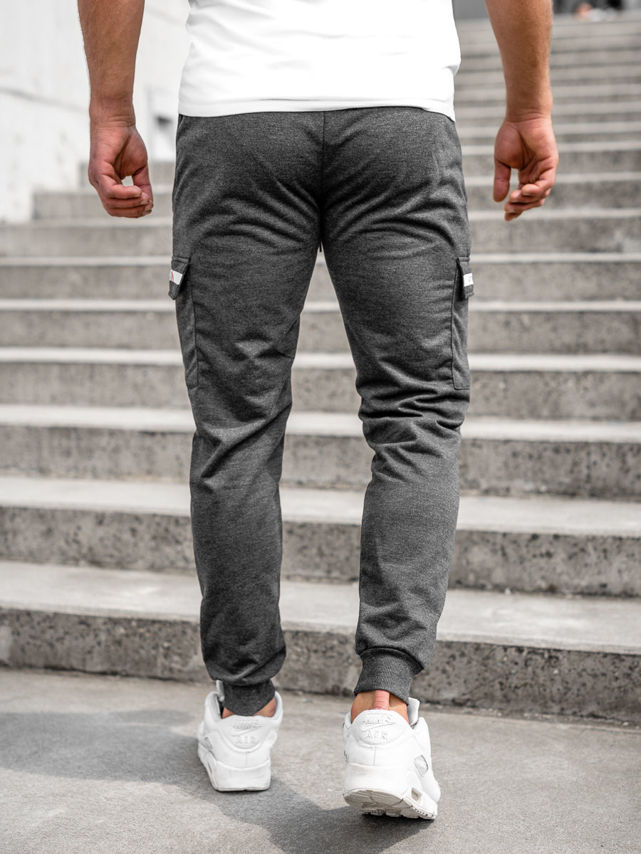 Pantalón cargo de chándal para hombre Bolf JX5063A de color grafito es un éxito de estilo primaveral y otoñal. Gracias al ajuste con un elástico fuerte y cordón en la cintura, se ajusta perfectamente a la silueta. Cuenta cos dos bolsillos externos con cierre de cremallera y dos bolsillos laterales con solapa.. Perneras acabadas en punto elástico. Debido de la alta calidad de tela, 65% de algodón, 30% de poliéster y 5% de elastano, no hay duda de que te sentirás muy cómodo llevándolo. Su estilo urbano les permite llevarlos todos los días. Realiza un look clásico y atemporal con una camiseta de manga corta y una sudadera.