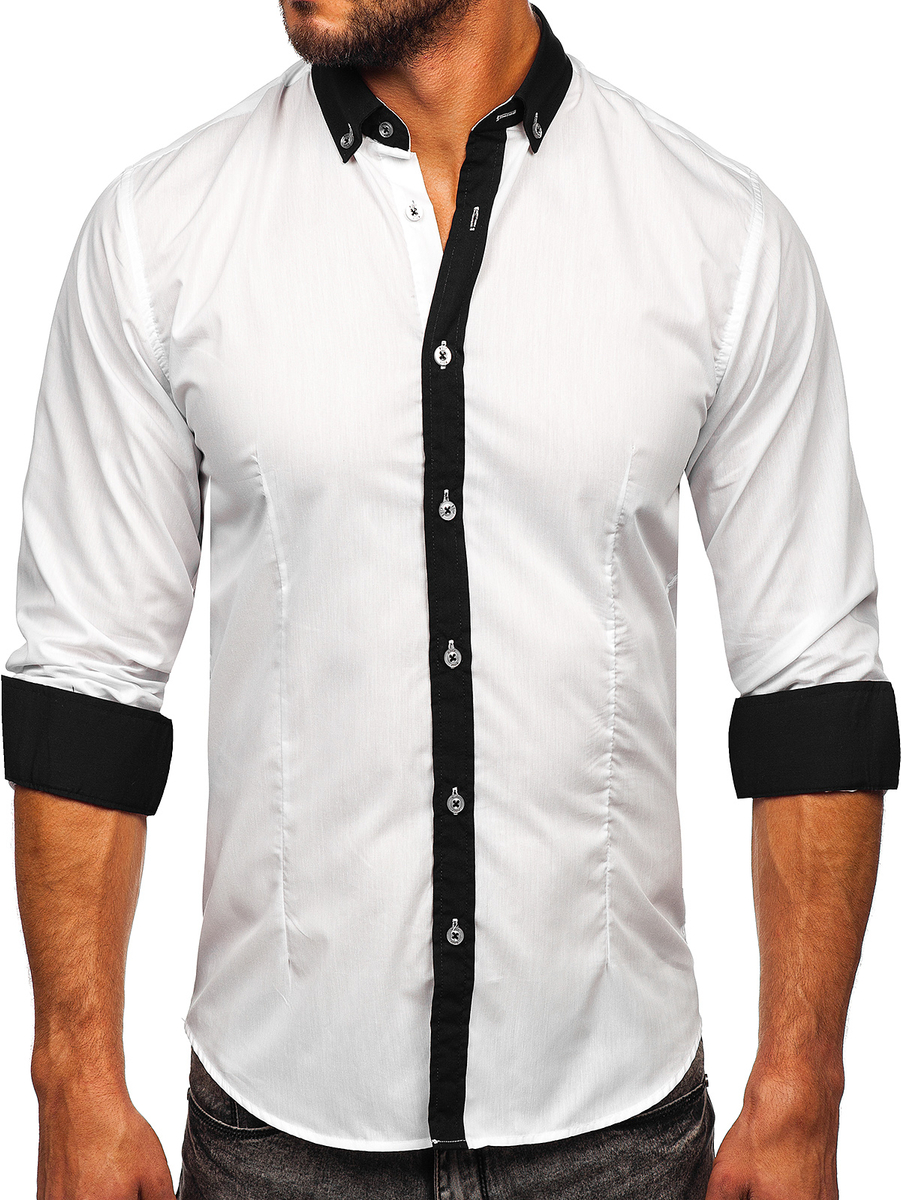 Camisa elegante de manga larga para hombre Bolf 21750 de color blanco le encantará de todo hombre elegante. Camisa de manga larga con cierre de botones y con cuello americano. El corte slim fit más de moda con un bajo redondeado se ajusta perfectamente al silueta. Puños sencillos, rectos, ajustables con un botón. Franja decorativa junto a los botones le añade carácter. El modelo está disponible en varios colores. Su elegancia le permite crear un look para toda ocasión. Combine su look elegante con chinos y una americana. Con unos vaqueros y una chaqueta de cuero se puede crear un look casual.