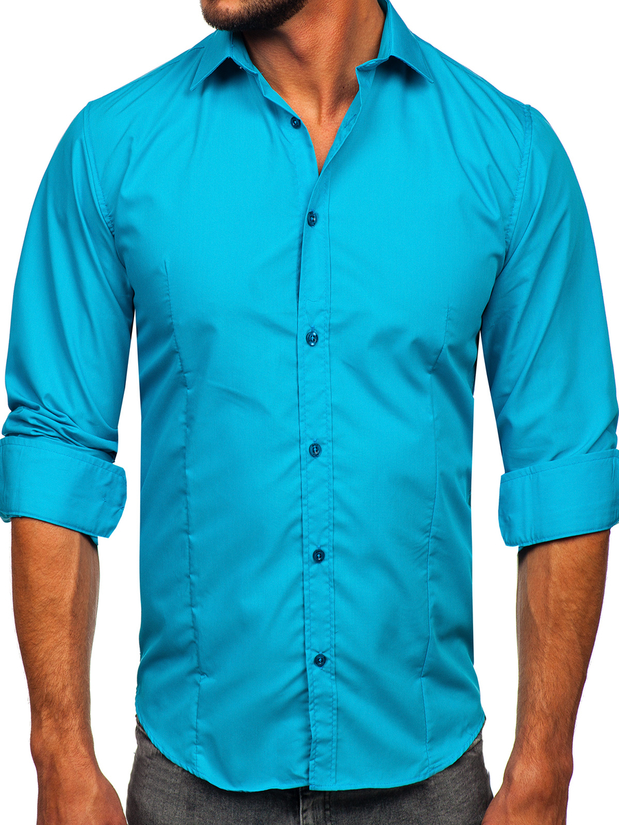 Camisa elegante de manga larga para hombre Bolf 1703 de color turquesa claro es una prenda que no puede faltar en el armario de todo hombre, y no sólo de los elegantes. Este modelo está disponible en más de una docena de colores más o menos intensos, con lo que es fácil de combinar con numerosos outfits casuales y smart casuales. Se recomienda a los fans del minimalismo y la elegancia clásica de la moda. Cómodas y bien cosidas. Una prenda que no puede faltar en el armario de un hombre de negocios consciente. El corte sencillo y clásico en más colores interesantes hacen que este modelo sea un complemento perfecto para varios outfits diarios. Tiene un corte slim fit, cuenta con cierre de botones y un práctico bajo redondeado. Sus mangas están acabadas con puños anchos y ajustables con un botón. Cuenta con un cuello clásico con solapas cortas.
