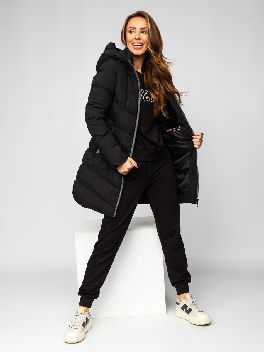 Chaqueta acolchada larga para mujer Bolf 7089 de color negro estupenda para el invierno. Cuenta con un cierre de cremallera y está forrado por dentro. Tiene una capucha extraíble que se puede ajustar con un cordón y un cuello alto. Confeccionada con una tela resistente que protege de la lluvia y la nieve. Acolchados en la totalidad evitan el movimiento del relleno y lo mantienen en el mismo lugar para un mayor aislamiento. Tiene bolsillos exteriores con cierre de cremallera y un bolsillo interior sin cierre adicional. Con unos vaqueros y un jersey, crearás un look para todos los días.