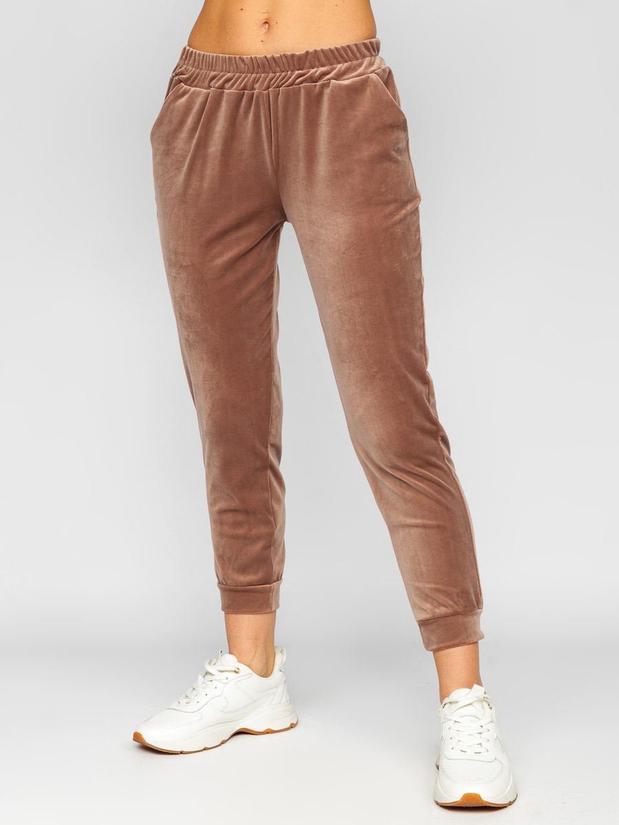 Chándal de velour Bolf 643 para mujer es muy agradable al tacto y cómodo. Es ideal para el gimnasio y las salidas con amigos. Sudadera tipo pulóver tiene una capucha ajustable con cordón. Chándal realza bien la silueta y los bajos acabados en punto elástico adelgazan aún más la pierna. La sudadera y el pantalón pueden llevarse juntos o por separado, por lo que ofrecen múltiples posibilidades de estilo. Con esta sudadera, unos vaqueros mom fit y un chaleco se puede crear un outfit casual de moda. Además, los pantalones cuentan con dos bolsillos en los que se puede guardar fácilmente un teléfono o pequeños artículos necesarios. Disponible en séis colores: fucsia, verde botella, negro, beige, marrón y violeta.