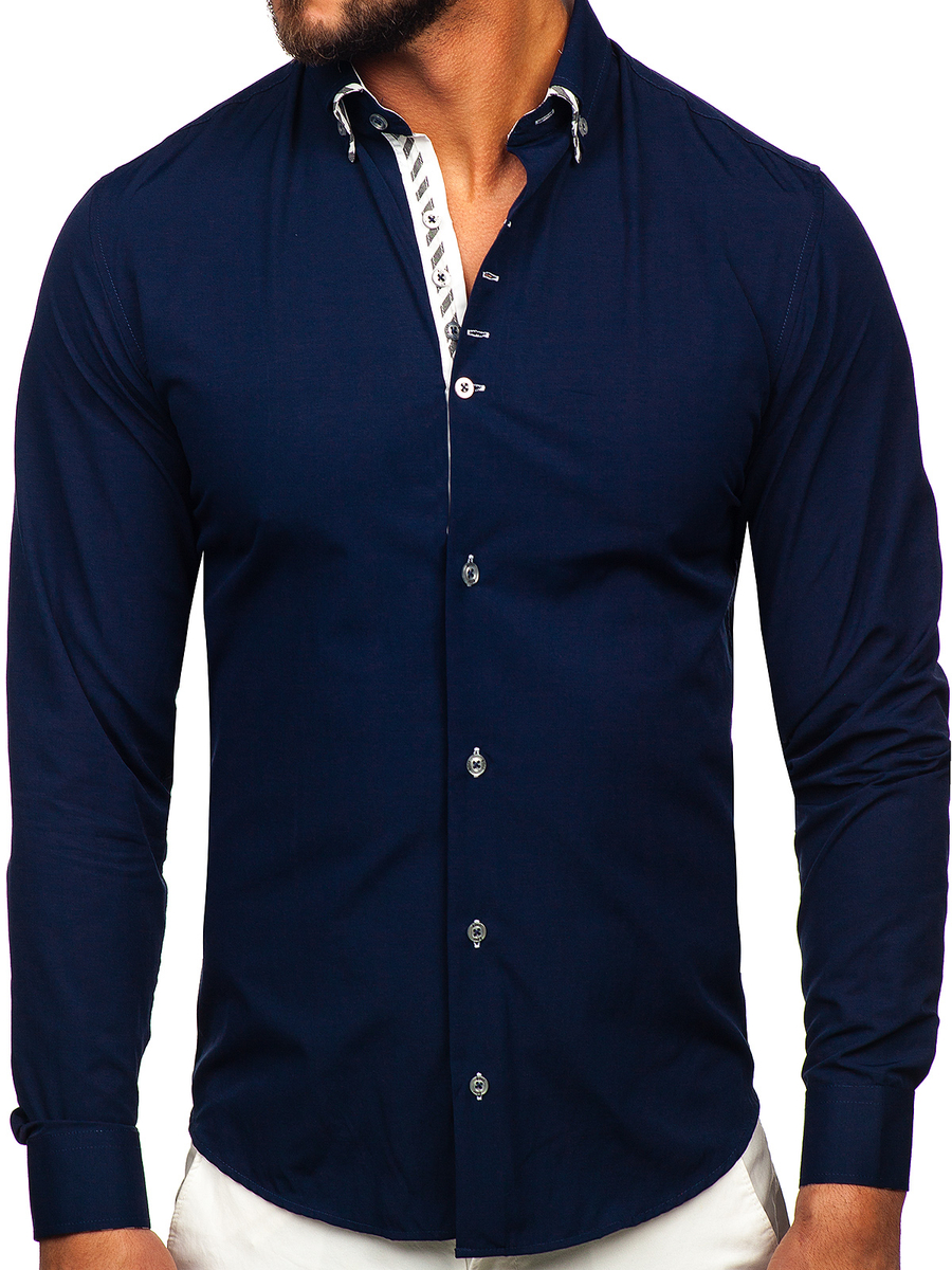 Camisa de manga larga Bolfslim fit excepcional de color azul oscuro. Acentúa los estilos, queda genial combinada con vaqueros o pantalón chino beige. Esta camisa azul oscuro de hombre tiene cuello original y cierre decorativo. Puedes llevarla también bajo la americana.