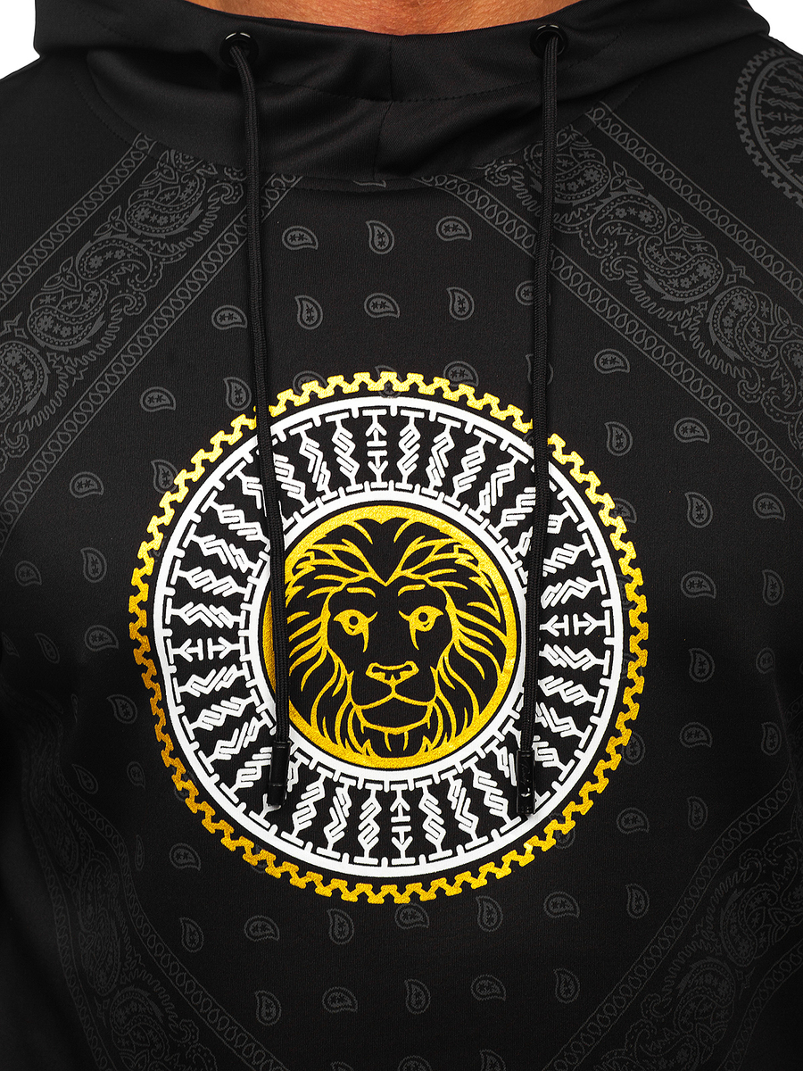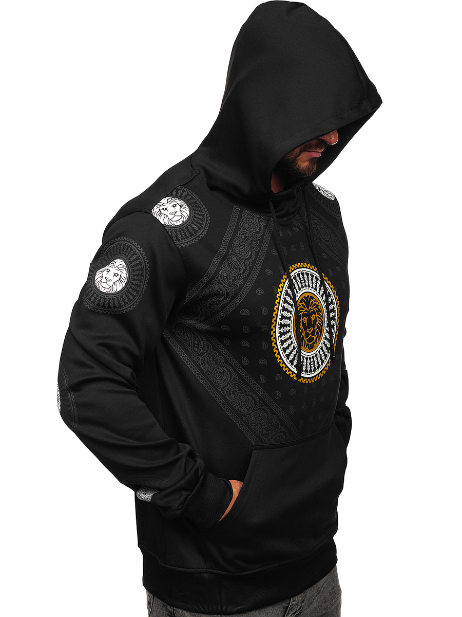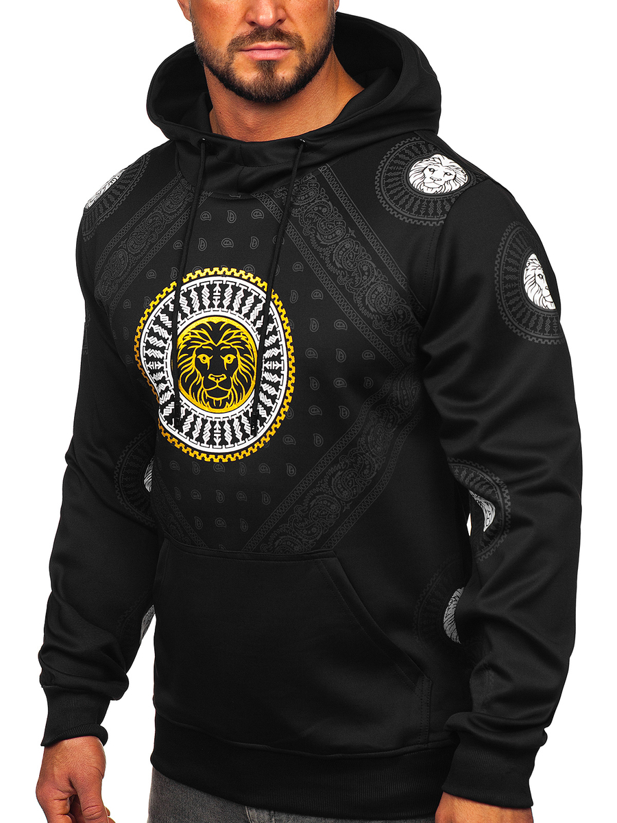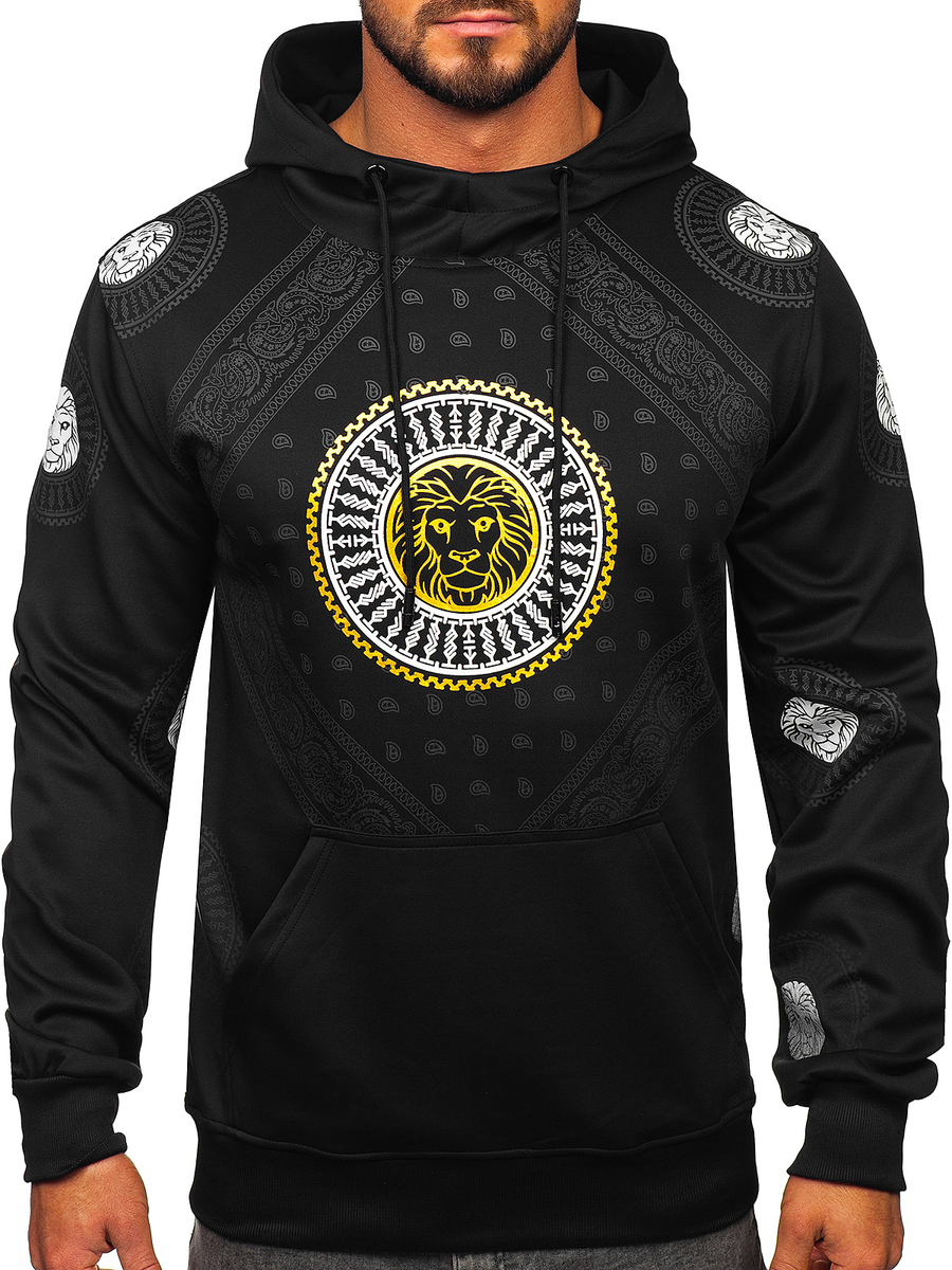 Sudadera para hombre Bolf 8B990 de color negro es un producto perfecto para los días más frescos. Sudadera tipo pulóver tiene una capucha ajustable con cordón estrecho de color negro. Protege bien del frío y del viento. Además, está confeccionada con una tela suave y agradable al tacto. Cuenta con un gran bolsillo tipo canguro de bastante capacidad en la parte delantera, en el que se puede guardar el teléfono o cualquier otro artículo pequeño necesario. Uno de los elementos distintivos es el diseño de leones dorados y blancos en la parte delantera y las mangas. Se combina genial con unos joggers y una chaqueta deportiva. Disponible en tallas: M, L, XL y 2XL.