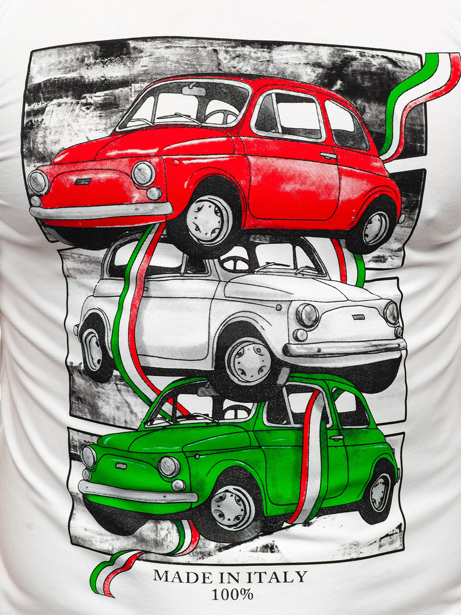 Camiseta de manga corta con impresióń para hombre Bolf HM918 de color blanco, ideal para llevar a diario. Confeccionada con algodón de alta calidad, es suave y agradable al tacto. Elastano adicional en la material garantiza una flexibilidad suficiente, lo que la hace cómoda de llevar y no estorba los movimientos. Realza perfectamente la silueta y los hombros. Su llamativo impresión de moda en la parte delantera atrae todas las miradas. Será fantástica tanto para un estilo cotidiano como urbano. Vale la pena combinarla con una chaqueta beisbolera y unos pantalones cargos.