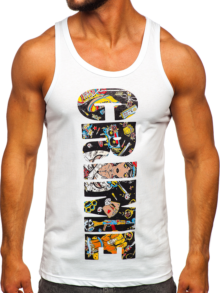 Camiseta de tirantes anchos con impresión Bolf 143031 de color blanco, ¡una prenda imprescindible que realzará y destacará tu estilo único!! Confeccionada con una tela suave de alta calidad, esta camiseta garantiza la máxima comodidad y libertad de movimientos. Cuenta con un escote redondo y el corte regular. El motivo decorativo de la parte delantera le añade un carácter único que le permitirá destacar entre la multitud. No importa la ocasión, esta camiseta atraerá todas las miradas y generará reacciones positivas. Vale la pena combinarla con unos vaqueros o pantalones cortos.
