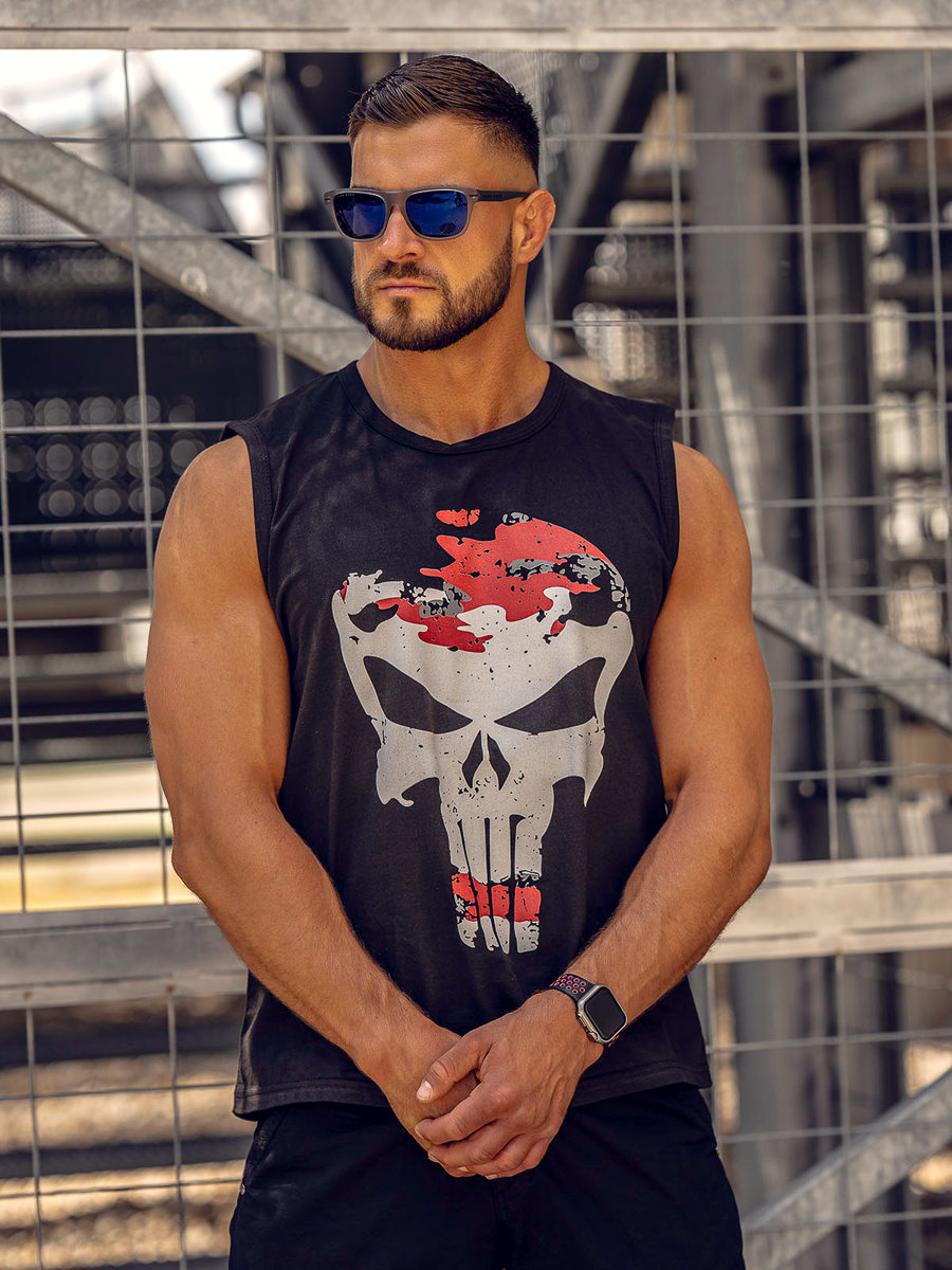 Camiseta de tirantes con impresión Bolf 14822A de color negro y rojo, la opción perfecta para aquellos que valoran el estilo original y el confort. Confeccionada con una tela ligera y transpirable, garantiza el confort y la libertad de movimientos. Es perfecta para los paseos veraniegos, los entrenamientos en el gimnasio, el jogging o las demás actividades físicas. La impresión le añade un carácter único y un look de moda. Se combina genial con unos joggers, pantalones cortos, así como con unos pantalones deportivos.