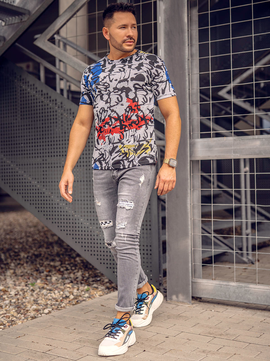 Camiseta de manga corta con impresión para hombre Bolf 14901A de color gris con la que quedarás genial durante tus paseos, salidas por la ciudad o encuentros con amigos. El look estiloso de esta camiseta te destacará entre la multitud y atraerá todas las miradas. Cuenta con un escote redondo y está confeccionada con un 100% de algodón, que la hace flexible y agradable al tacto. El producto está diseñado para los partidarios del estilo urbano. Se combian genial con unos joggers y vaqueros.