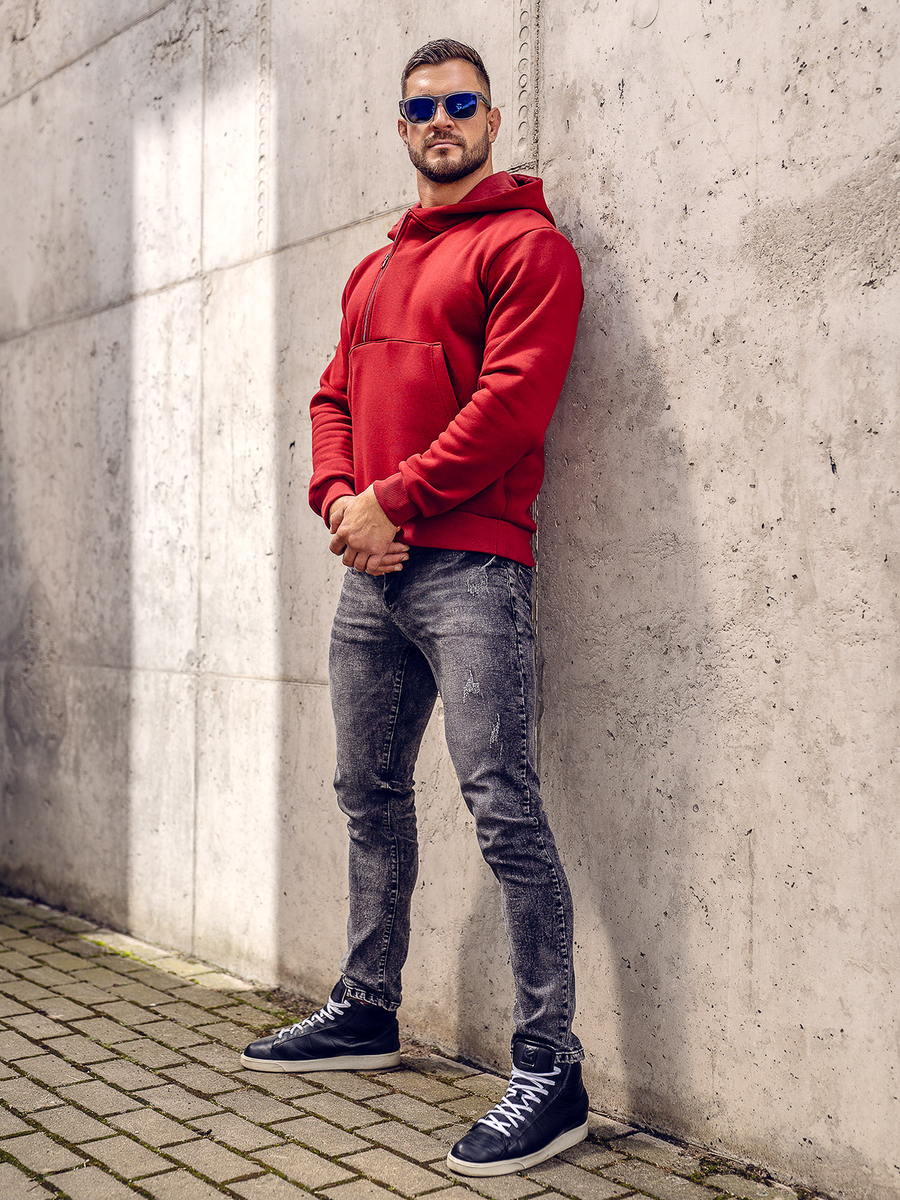Sudadera con capucha para hombre Bolf 02A de color burdeos, nuestra opción para los días más frescos. Cuenta con una capucha y un bolsillo canguro atemporal. Confeccionada en una tela muy suave y agradable al tacto. Se compone de un 70% de algodón y un 30% de poliéster. Está disponible en varias e interesantes versiones de color, para que pueda combinarla con todos los estilos. Bajo y puños estan acabados con un punto elástico ancho para asegurar el abrigo en los días más frescos. Le gustará tanto quele estará acompañando en todas las temporadas del año. Es perfecta para pasear o salir por la ciudad con los amigos. Con nuestros pantalones de chándal, esta sudadera es la combinación perfecta para las personas activas. Para todos los días, la sudadera quedará genial con unos vaqueros y una chaqueta de cuero.