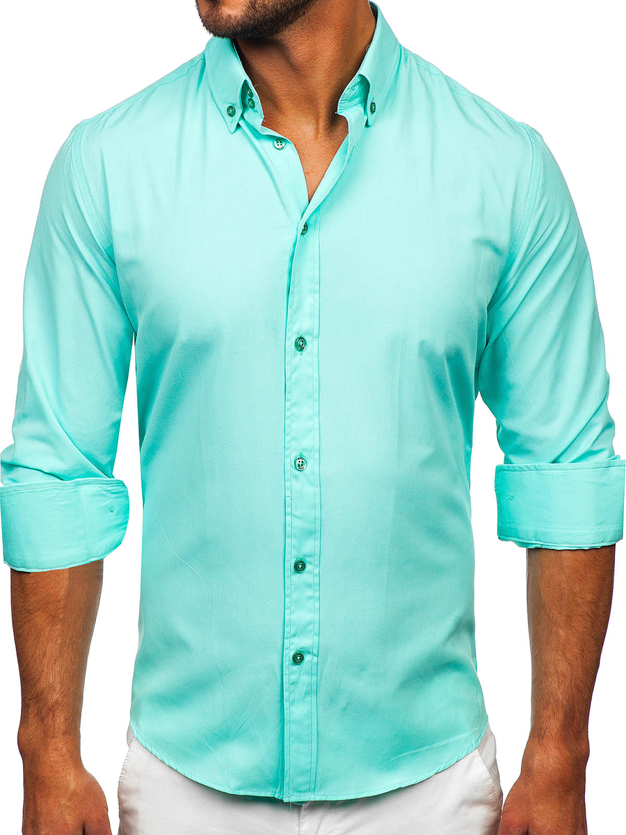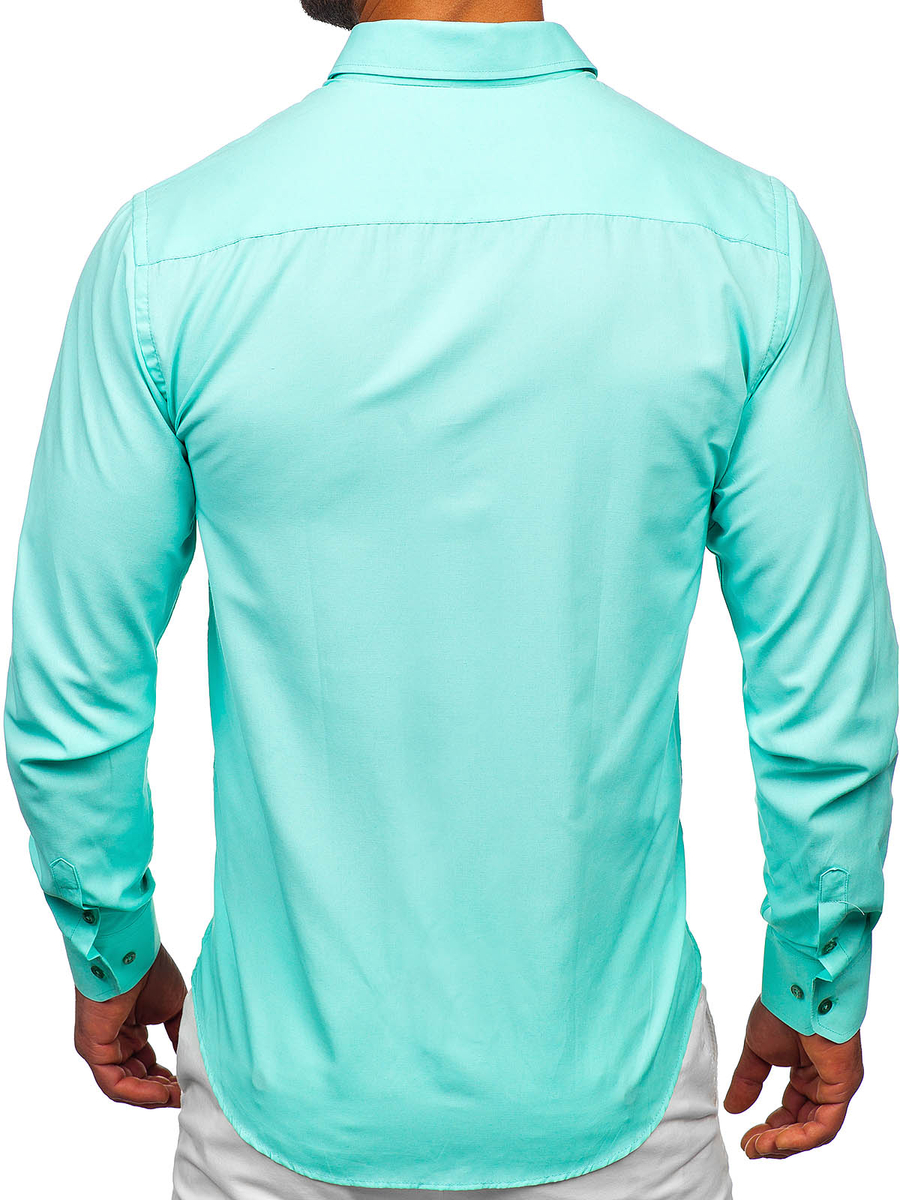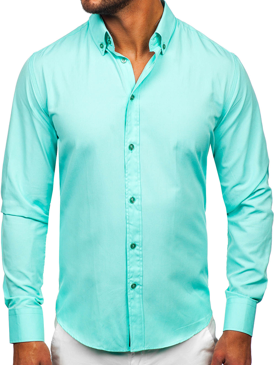 Camisa de hombre Bolf elegante de color azul turquesa claro, perfecta para crear estilos tanto formales como diarios. Adelgaza perfectamente la silueta, les añade chic a los estilos. Esta camisa verde slim fit encanta con elegancia y a la vez con sus acentos casuales, p.e. con su cuello americano.