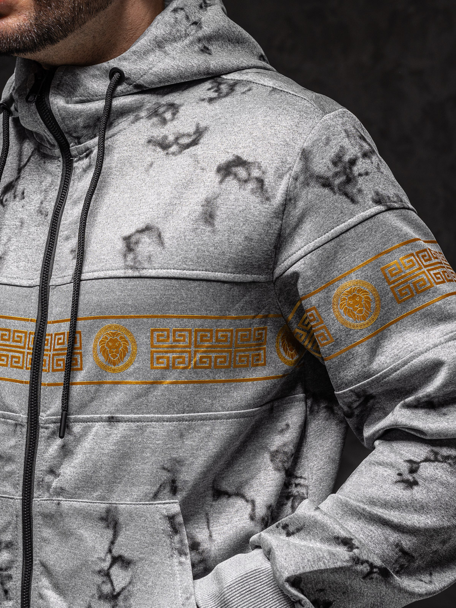 Sudadera abierta con capucha para hombre Bolf 27B8125A1 de color gris es un clásico atemporal del estilo cotidiano. Esta sudadera de corte clásico con capucha ajustable es perfecta para todos los partidarios de un estilo deportivo. Su impresión guay le añade un carácter único. Bajo y puños están acabados con un elástico que aporta calor y protege contra del viento en los días más frescos. Cuenta con dos bolsillos laterales sin cierre. Confeccionada con una tela muy agradable que garantiza el confort incluso durante el entrenamiento más exigente. ¿Estás buscando un outfit deportivo? ¡Combina esta sudadera con unos pantalones de chándal, una camiseta de manga corta y un chaleco!