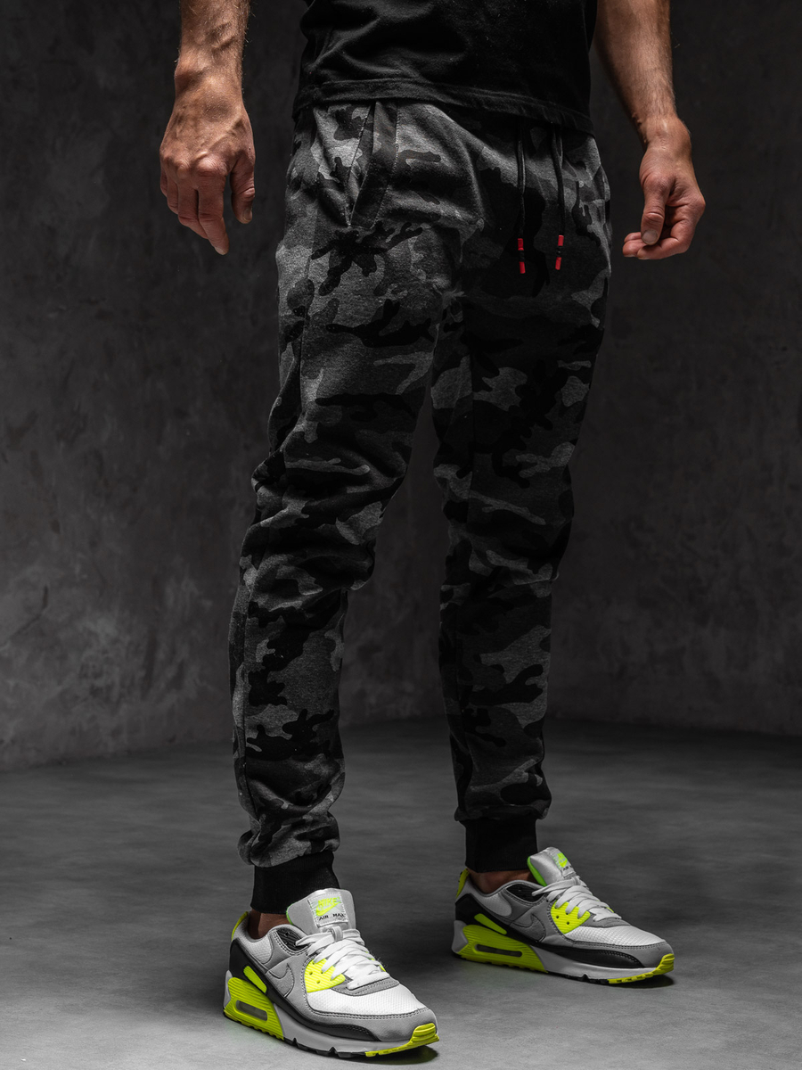 Pantalón deportivo Bolf para hombre, estampado de diseño camuflaje de moda, color grafito. Tiene 2 bolsillos y un punto elástico fuerte en la cintura, se ajusta con cordón. Ponte este pantalón camuflaje grafito con outfits de estilo urbano o deportivos con una camiseta y una sudadera oversize. Perfecta para llevar a diario.