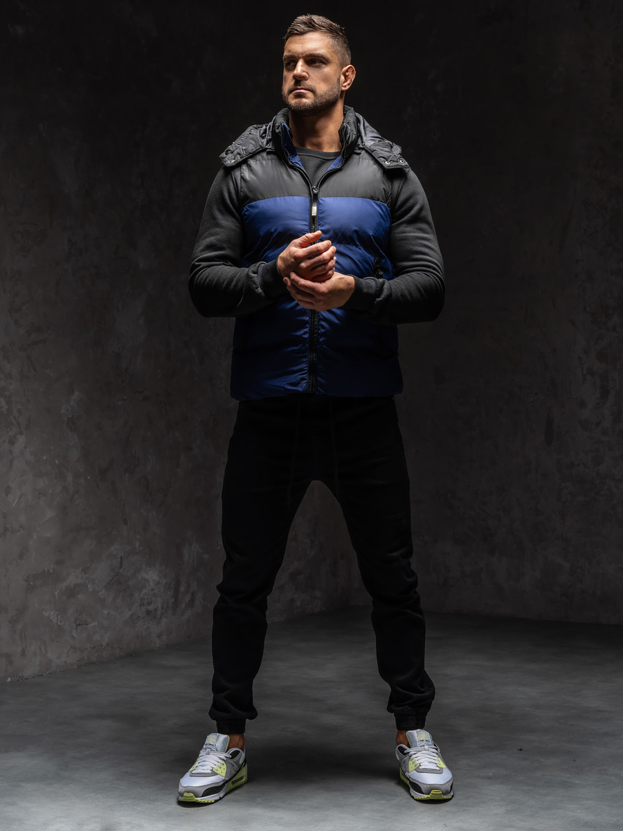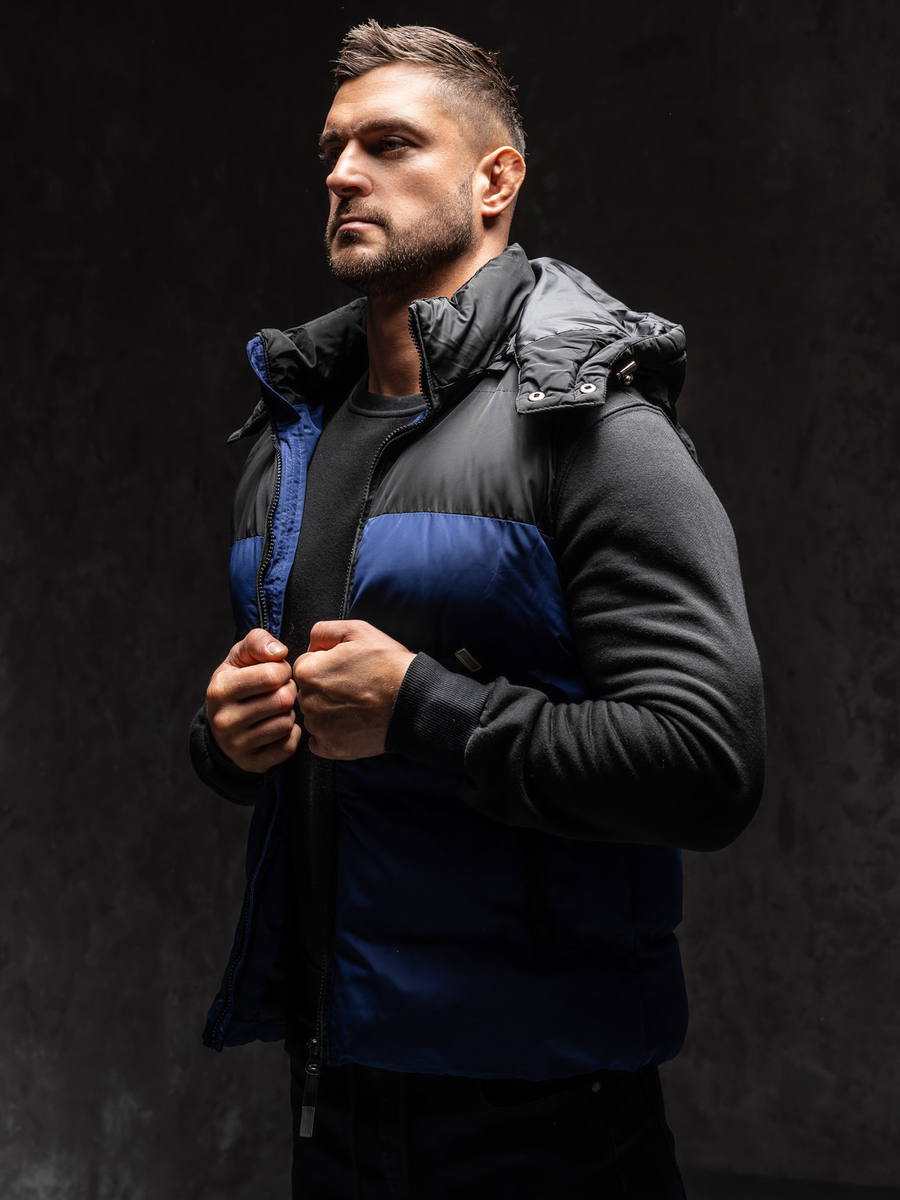 El chaleco acolchado con capucha para hombre azul marino Bolf 1189A1 es un producto acolchado. El chaleco incluye una capucha desmontable que protege perfectamente contra la humedad en los días de lluvia. El artículo se cierra con una cómoda cremallera. El chaleco tiene cuello alto. Una gran ventaja del producto son los tres bolsillos con cremallera. Dos espaciosos bolsillos externos pueden servir como protección para tus manos contra las heladas en los días fríos. El bolsillo interior es perfecto para guardar llaves, teléfono, documentos u otros objetos pequeños. La capucha tiene cordones que la hacen ajustable. Esto lo convierte en una excelente protección contra el frío y la lluvia.
