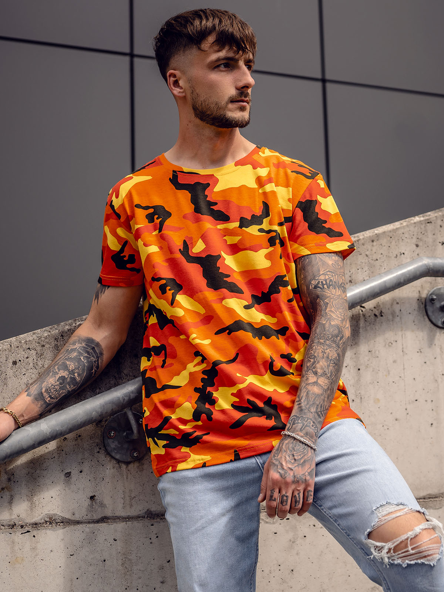 Camiseta de manga corta camuflaje para hombre Bolf S807A1 de color naranja con un diseño camuflaje atemporal y de moda. El llamativo color será el complemento perfecto para tu vestuario. Cuenta con un escote redondo que la hace fácil de colocar por encima de la cabeza. El bajo de la camiseta es redondeado, por lo que se ajusta a todo tipo de siluetas. Esta camiseta es elástica y se ajusta perfectamente al cuerpo. Está confeccionada con una tela transpirable.