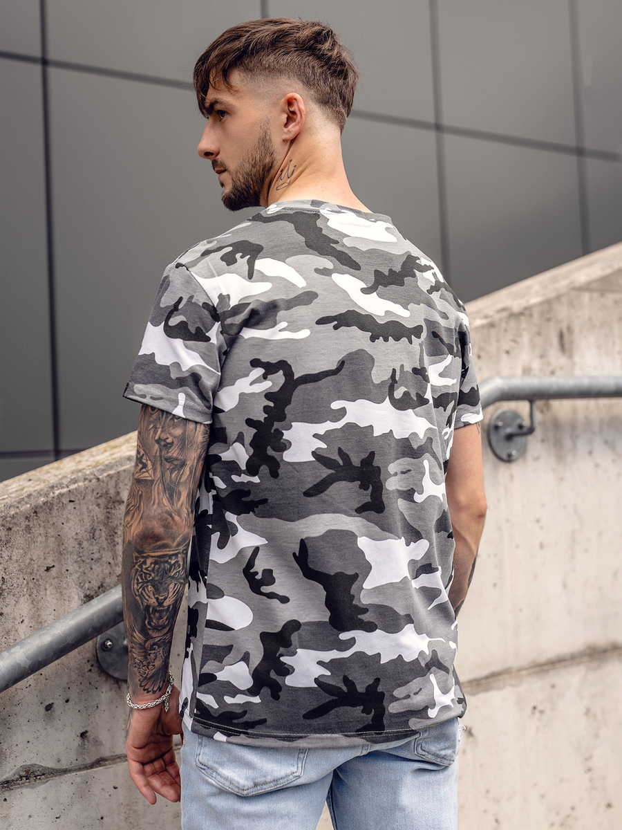 Camiseta de manga corta camuflaje para hombre Bolf S807A1 de color gris con un diseño camuflaje atemporal y de moda. El llamativo color será el complemento perfecto para tu vestuario. Cuenta con un escote redondo que la hace fácil de colocar por encima de la cabeza. El bajo de la camiseta es redondeado, por lo que se ajusta a todo tipo de siluetas. Esta camiseta es elástica y se ajusta perfectamente al cuerpo. Está confeccionada con una tela transpirable.