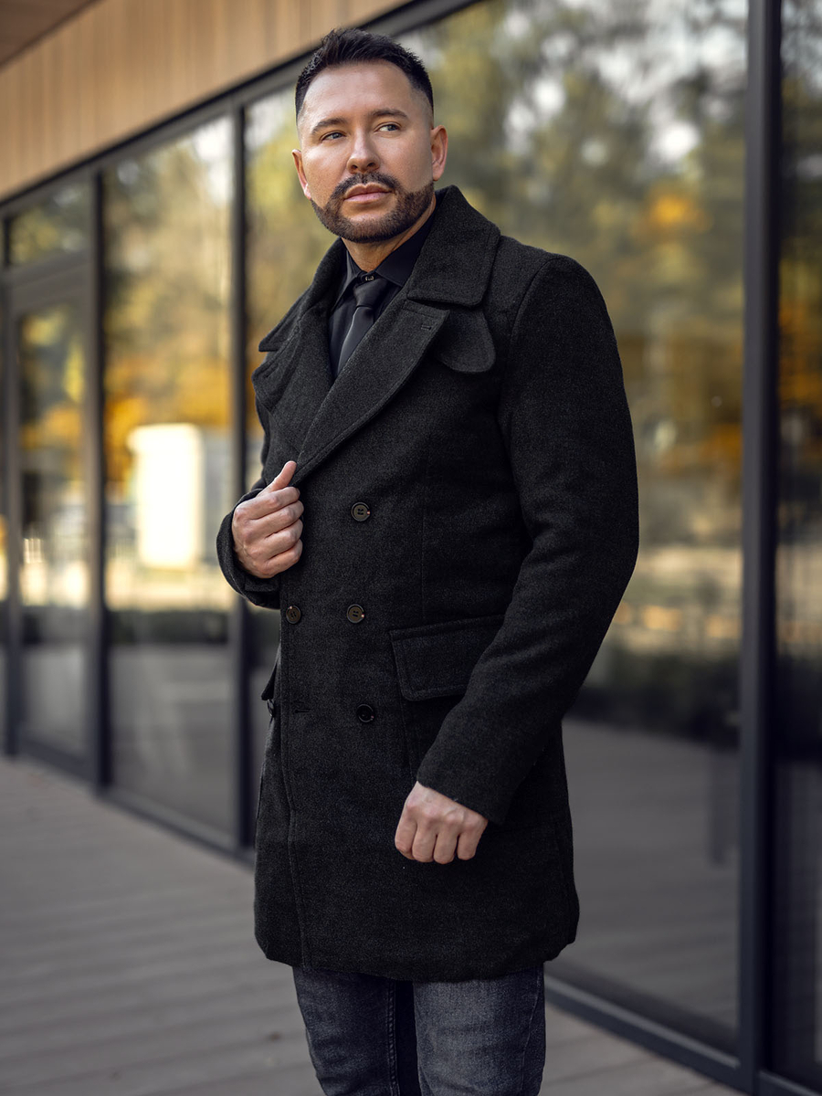 Abrigo para invierno para hombre Bolf 1048A2 de color negro, confeccionado con una tela forrada perfecta para el invierno. Cuenta con un cierre de botones y doble botonadura que le añade un look chic y sofisticado. Tiene dos bolsillos exteriores con cierre de botones automáticos con una solapa de moda, y un bolsillo interior con cierre de botón. Un abrigo de corte ajustado, sienta perfectamente a la silueta deportiva de un hombre. Se caracteriza por un cuello reversible y un cierre de botón adicional en el cuello. El color negro se combina perfectamente tanto con estilos atenuados como con los más atrevidos.